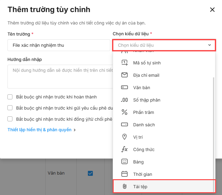 - Thiết lập trường tuỳ chỉnh đính kèm file