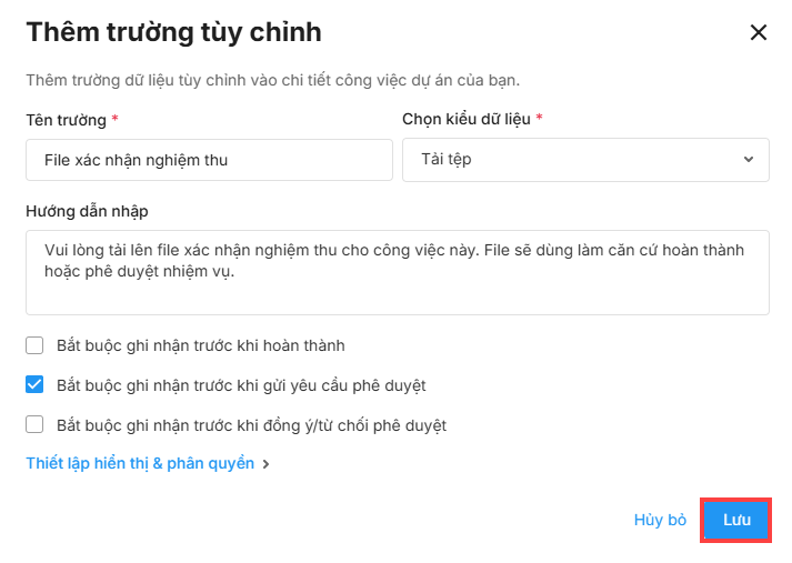 - Xem, đính kèm file vào trường: Người có quyền xem hoặc ghi nhận trường tùy chỉnh.