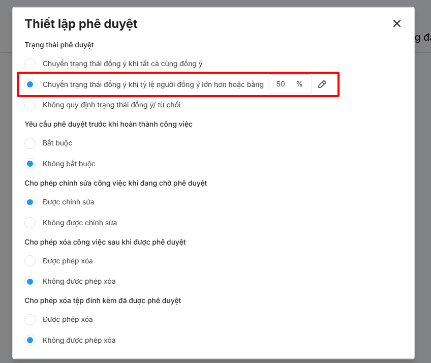 Bước 2: Trong giao diện thiết lập phê duyệt, chọn Chuyển trạng thái đồng >=50% người phê duyệt đồng ý ( có thể thay đổi %)