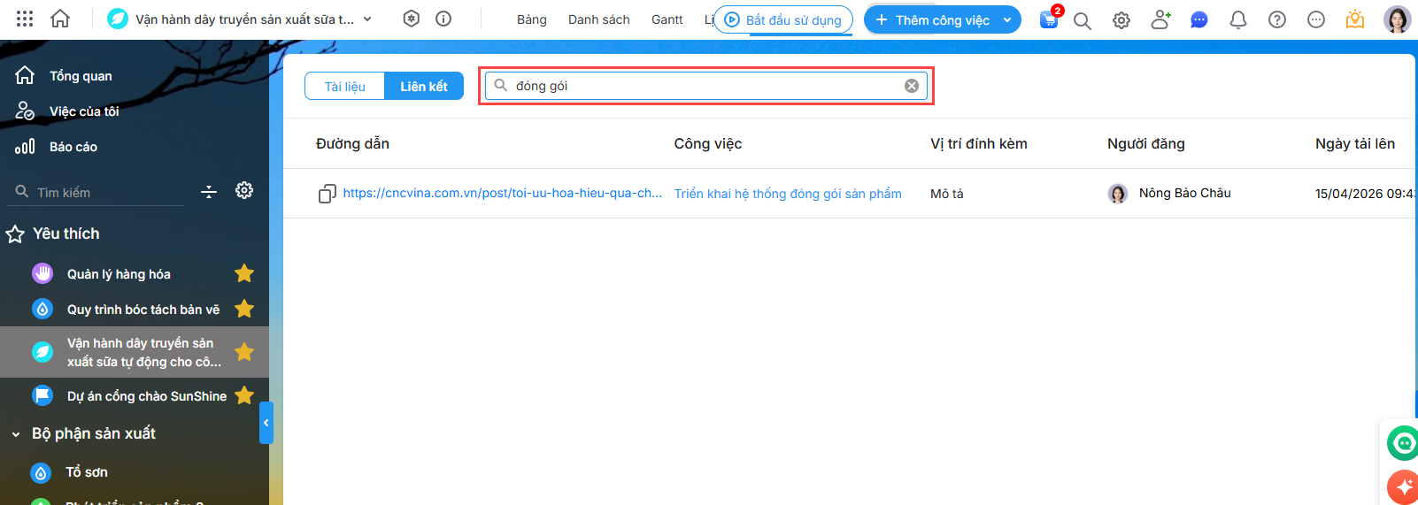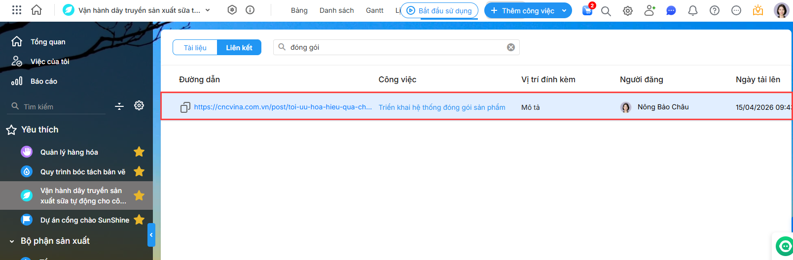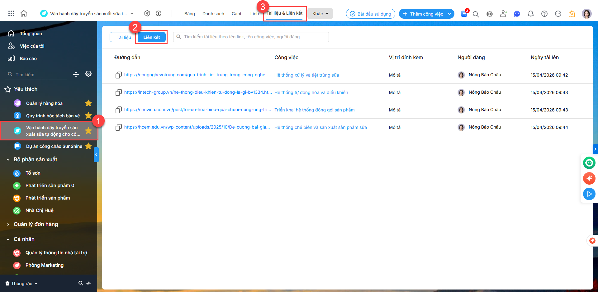 • Nhấn vào tab “Liên kết” chương trình sẽ hiển thị danh sách các link đã được thêm trong dự án với thông tin công việc gốc, vị trí đính kèm, người đăng và thời gian đăng.
