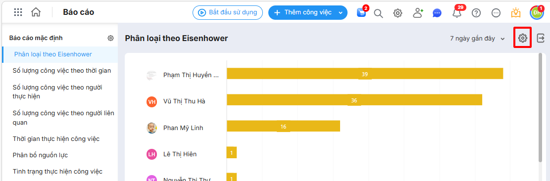 Bước 1: Trên giao diện báo cáo Phân loại theo Eisenhower, nhấn vào biểu tượng bánh răng ![]()