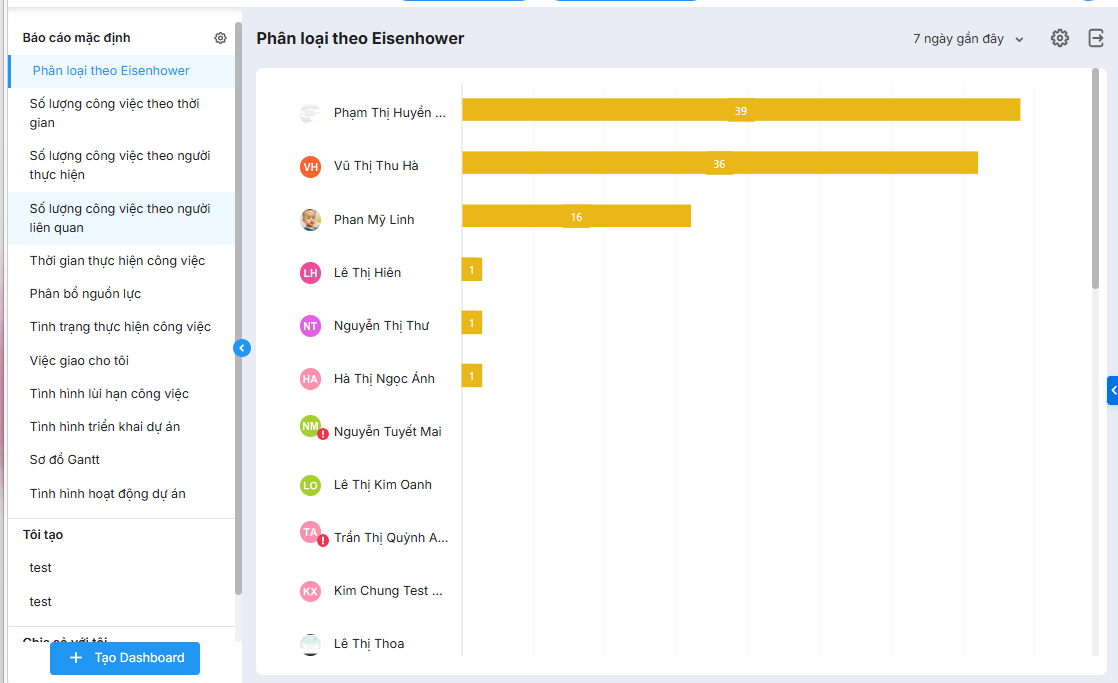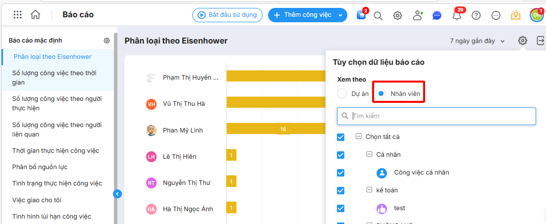 Bài viết hướng dẫn tính năng theo dõi số lượng công việc quan trọng, khẩn cấp của từng nhân viên. Tính năng này hỗ trợ quản lý dễ dàng so sánh hiệu suất, theo dõi tiến độ và đánh giá chất lượng hoàn thành công việc của từng thành viên, từ đó phân bổ nguồn lực hợp lý và nâng cao hiệu quả quản lý.