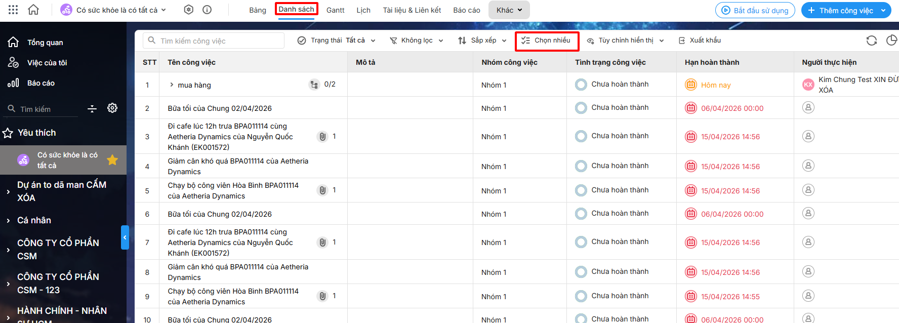 Bước 1: Trên giao diện công việc dạng Danh sách\ chọn chức năng Chọn nhiều.