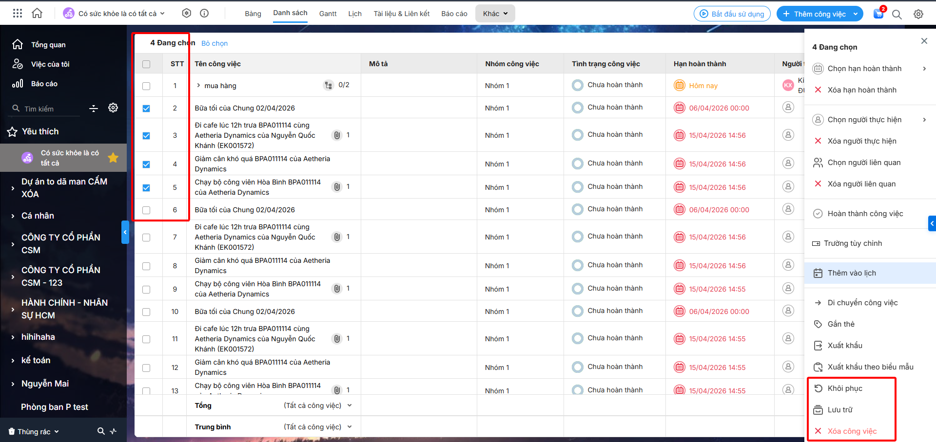 Bước 3: Tích chọn các công việc/dự án muốn thực hiện đồng loạt\ tùy chọn Khôi phục/Lưu trữ/Xóa các công việc đã được chọn.