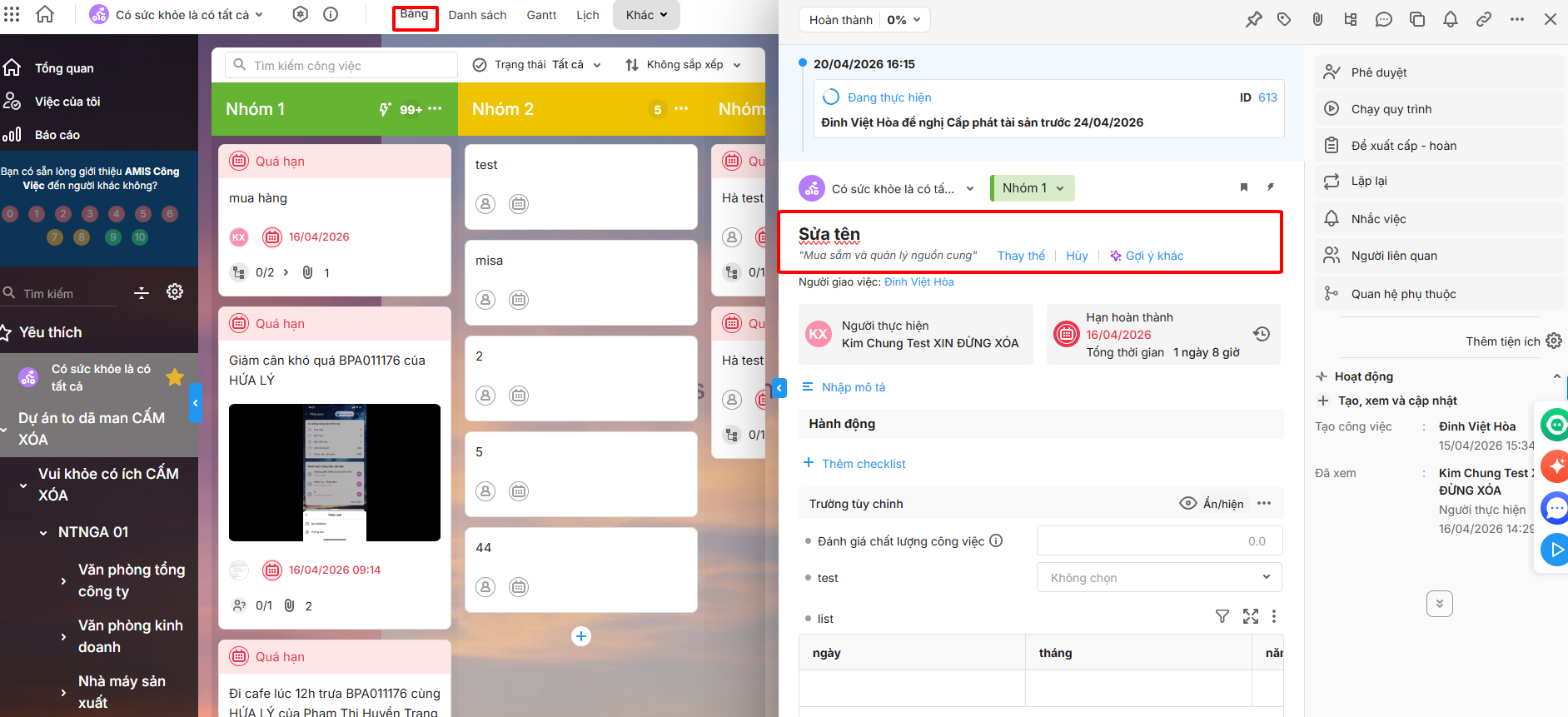 Bước 1: Tại giao diện chi tiết công việc cần chỉnh sửa, chọn xem dạng Bảng\ chọn chi tiết công việc muốn sửa tên.
