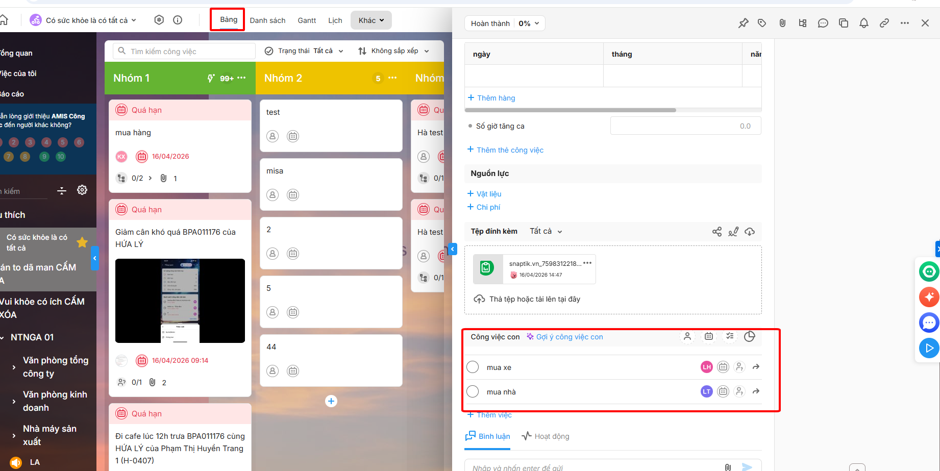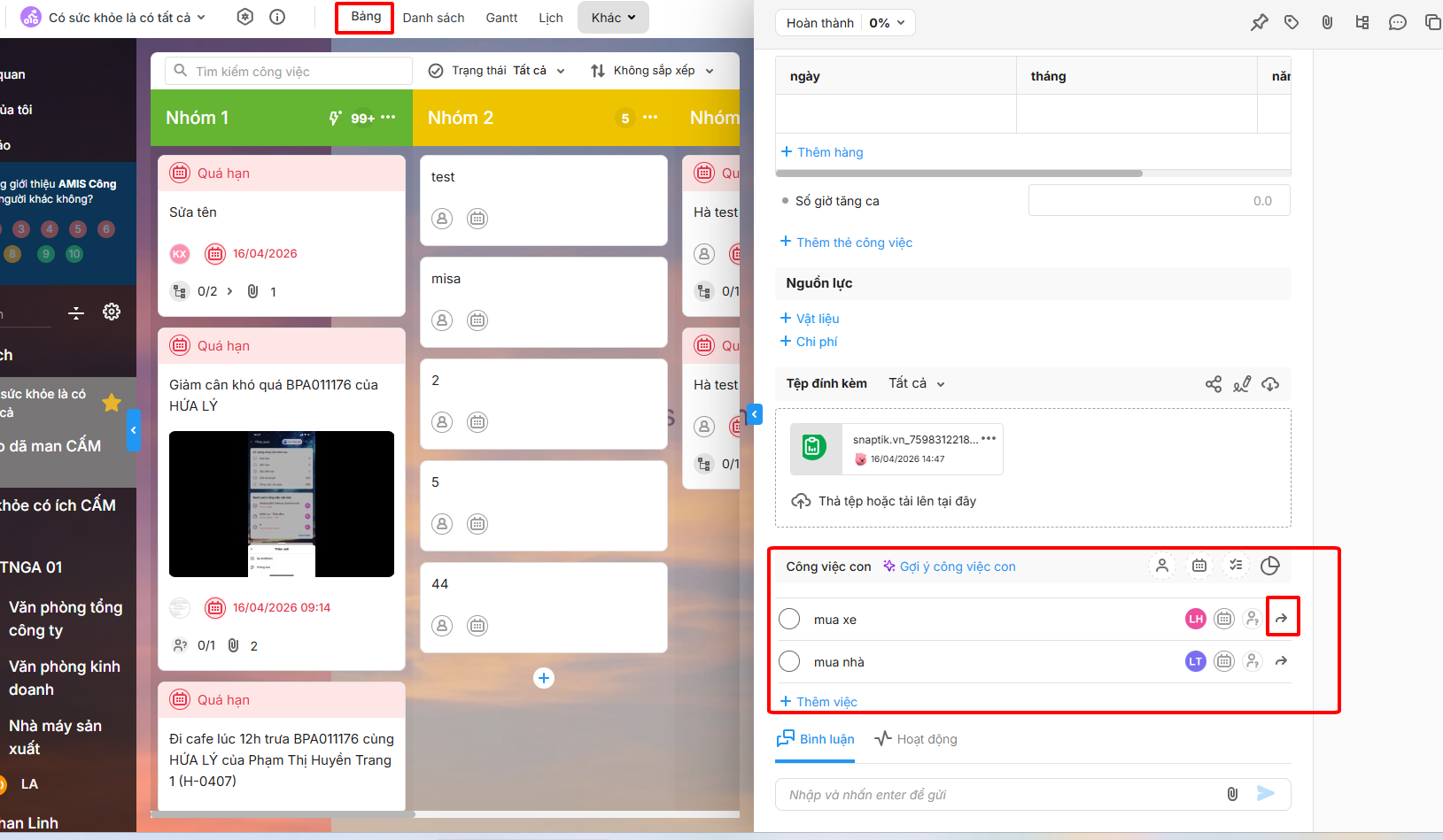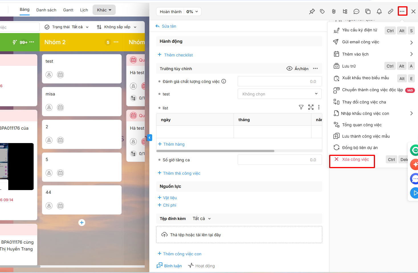 Bước 2: Chọn tới mục Công việc con, chọn công việc con cần xóa.