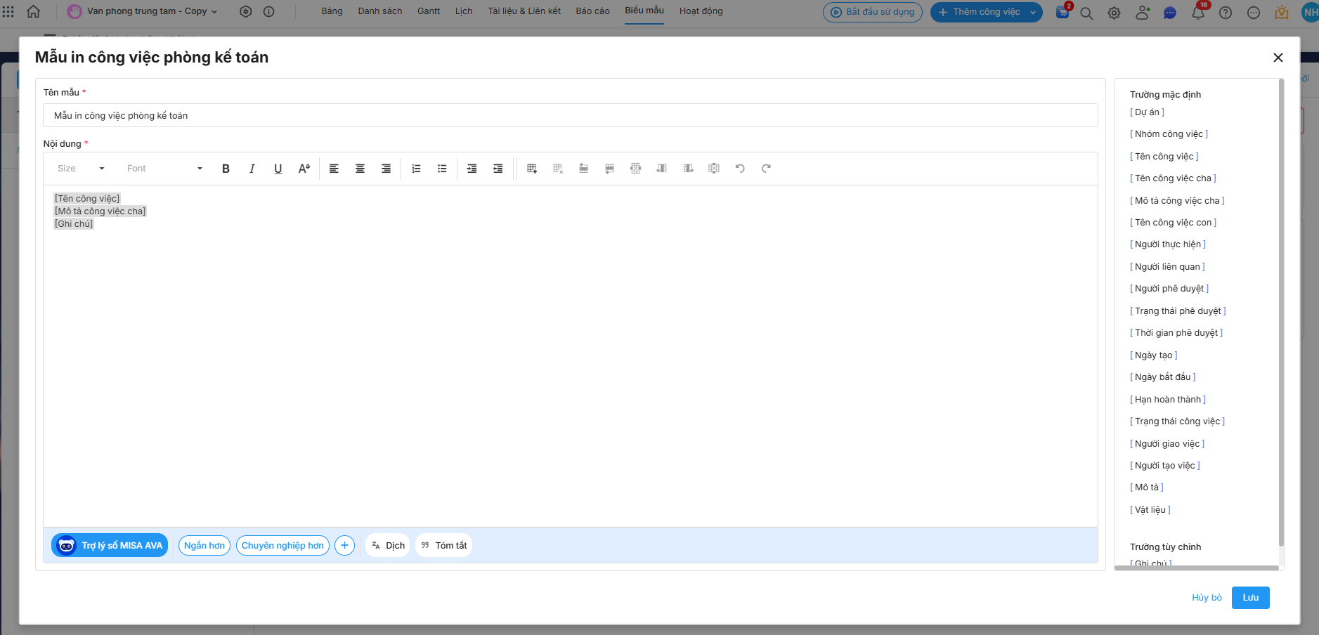 Chọn soạn thảo biểu mẫu\ chương trình cho phép soạn thảo trực tiếp trên phần mềm\ điền Tên mẫu và Nội dung, có thể lấy trường có sẵn trên công việc từ cột Trường mặc định\ nhấn Lưu để hoàn tất.