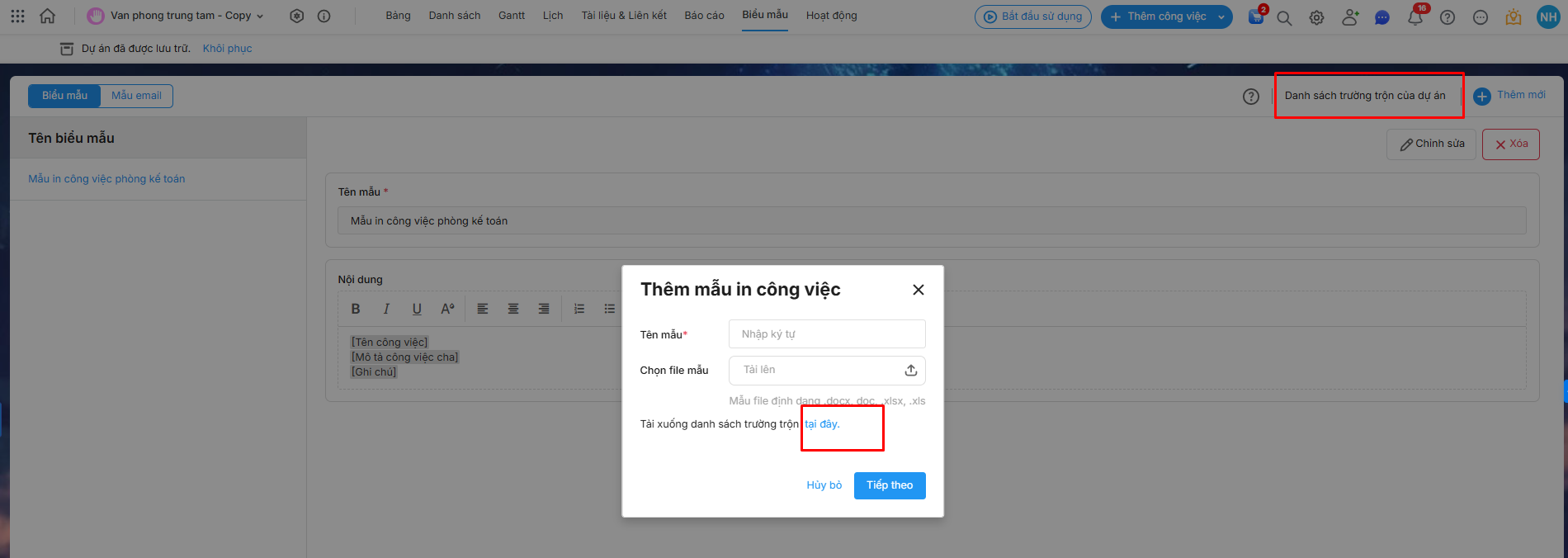 Bước 1: Chọn Tải lên biểu mẫu\ tải lên file đã soạn thảo sẵn (định dạng bắt buộc là Doc, Docx), trong file này cần chứa các trường trộn để khi xuất khẩu, chương trình đọc được và trích xuất dữ liệu từ các trường trên công việc vào trường trộn tương ứng trên biểu mẫu. Các trường trộn được định dạng như sau: