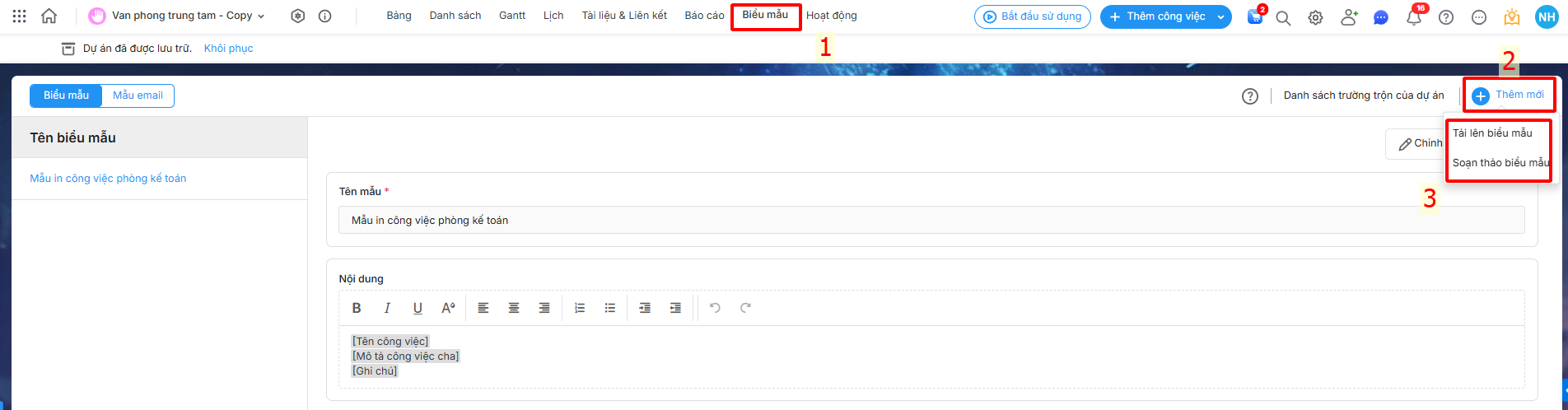 Trên giao diện dự án\ vào tab Biểu mẫu\ thêm mới Biểu mẫu\ chọn Tải lên biểu mẫu hoặc Soạn thảo biểu mẫu.