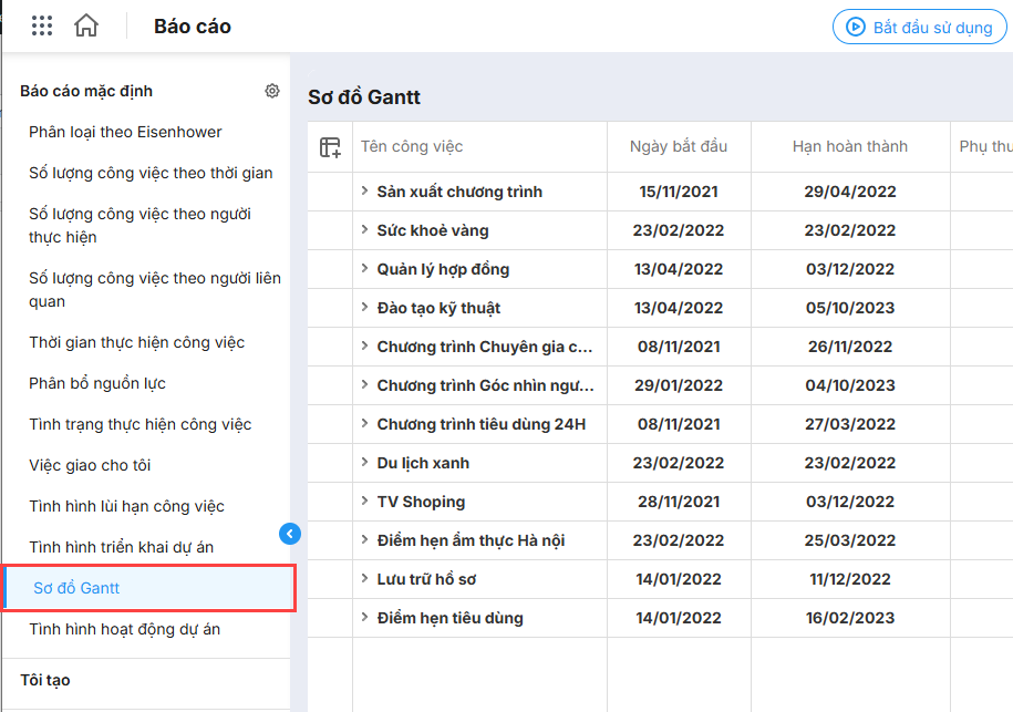 - Chọn Sơ đồ Gantt để hiển thị danh sách Gantt các dự án