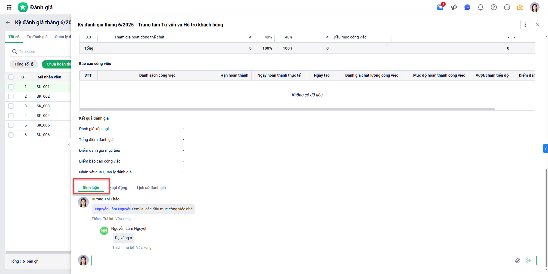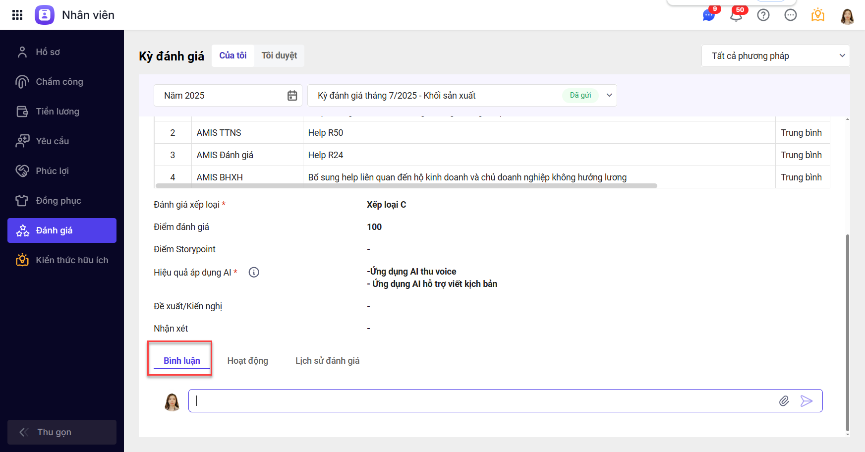 Tại AMIS Nhân viên\chi tiết Kỳ đánh giá\tab Bình luận: HR, quản lý, nhân viên có thể tương tác, bình luận trực tiếp trên phiếu.
