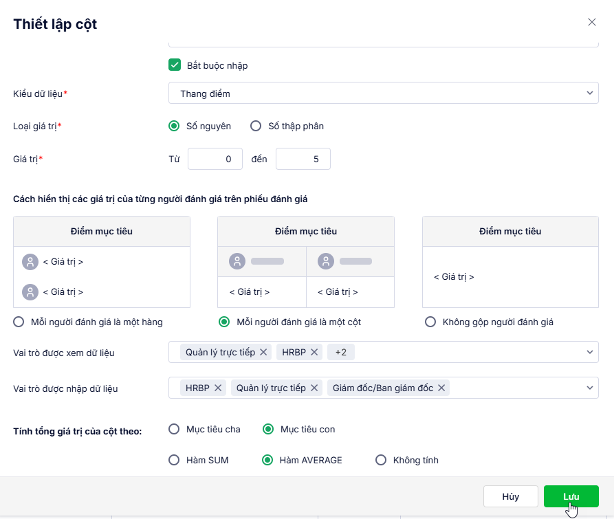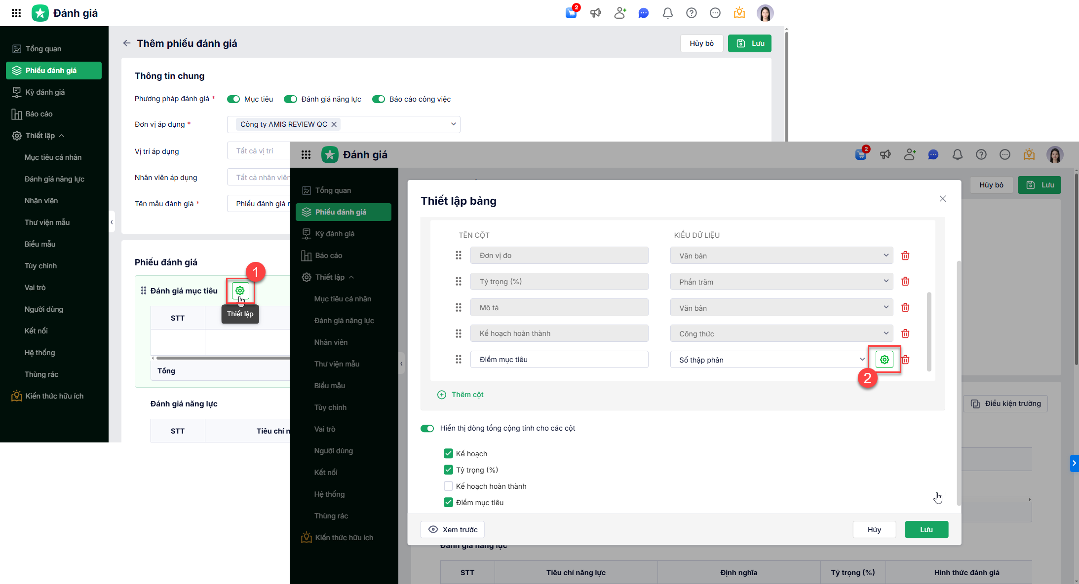 Tại chi tiết phiếu đánh giá\Thiết lập bảng\Thiết lập cột.