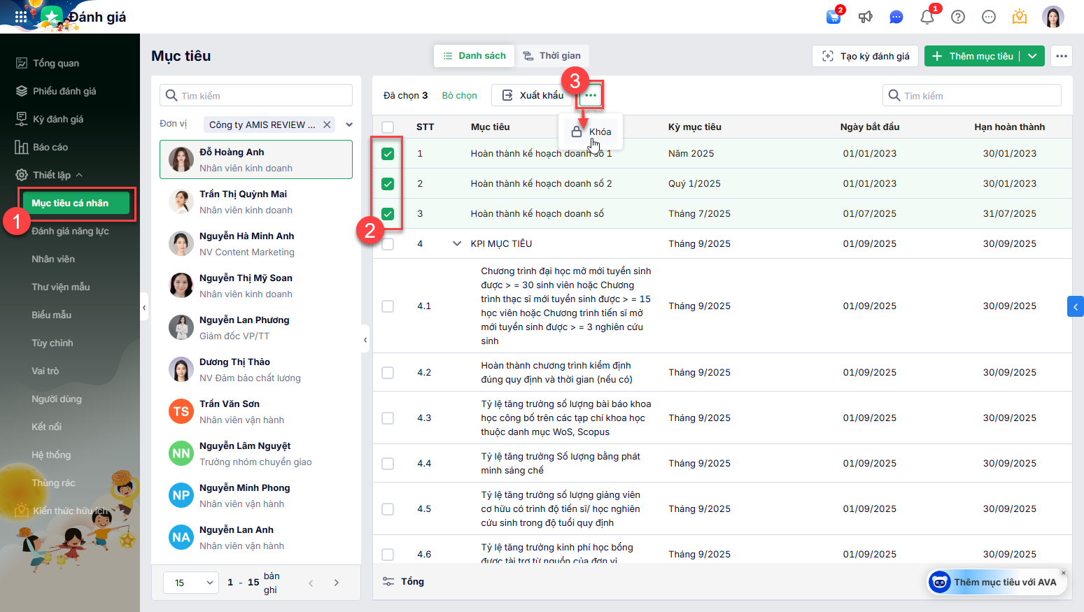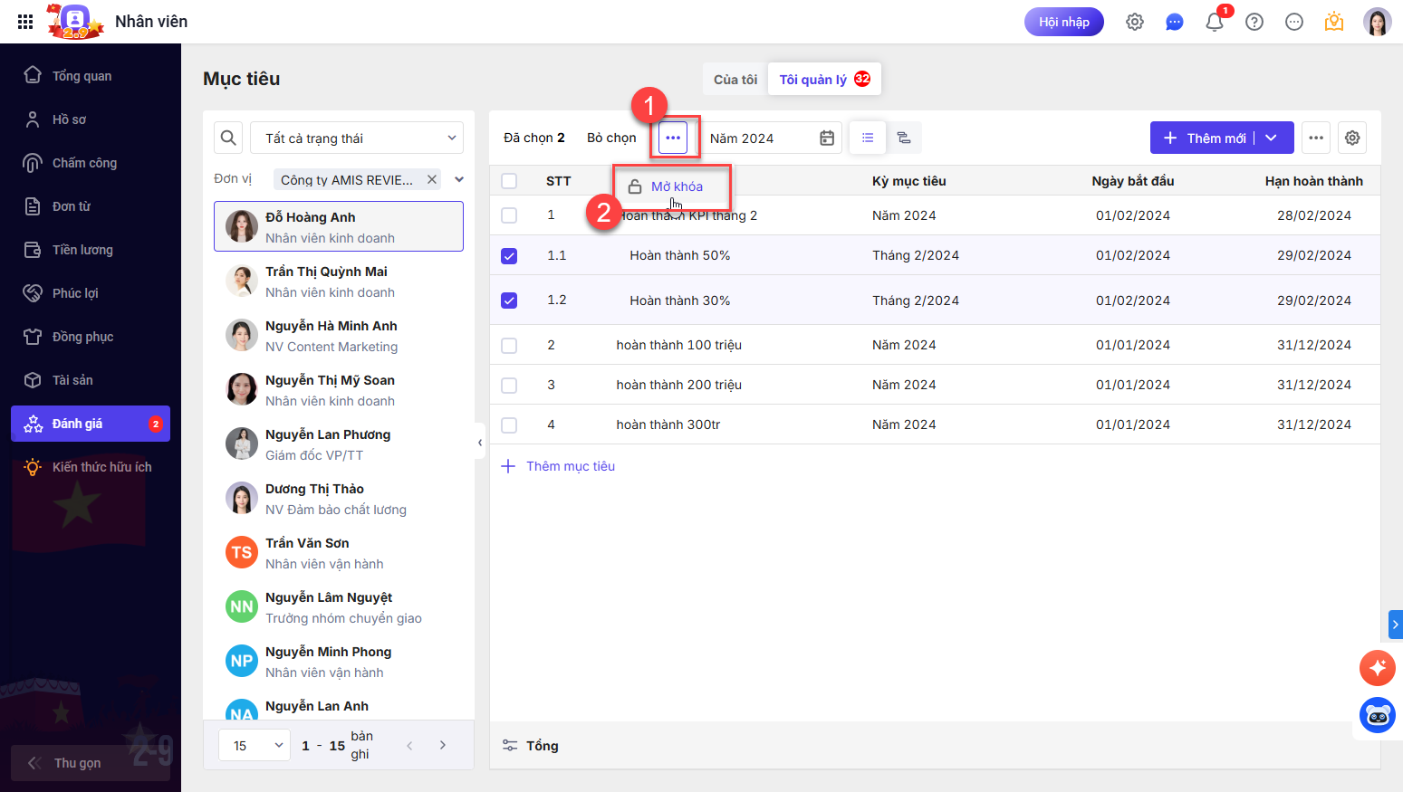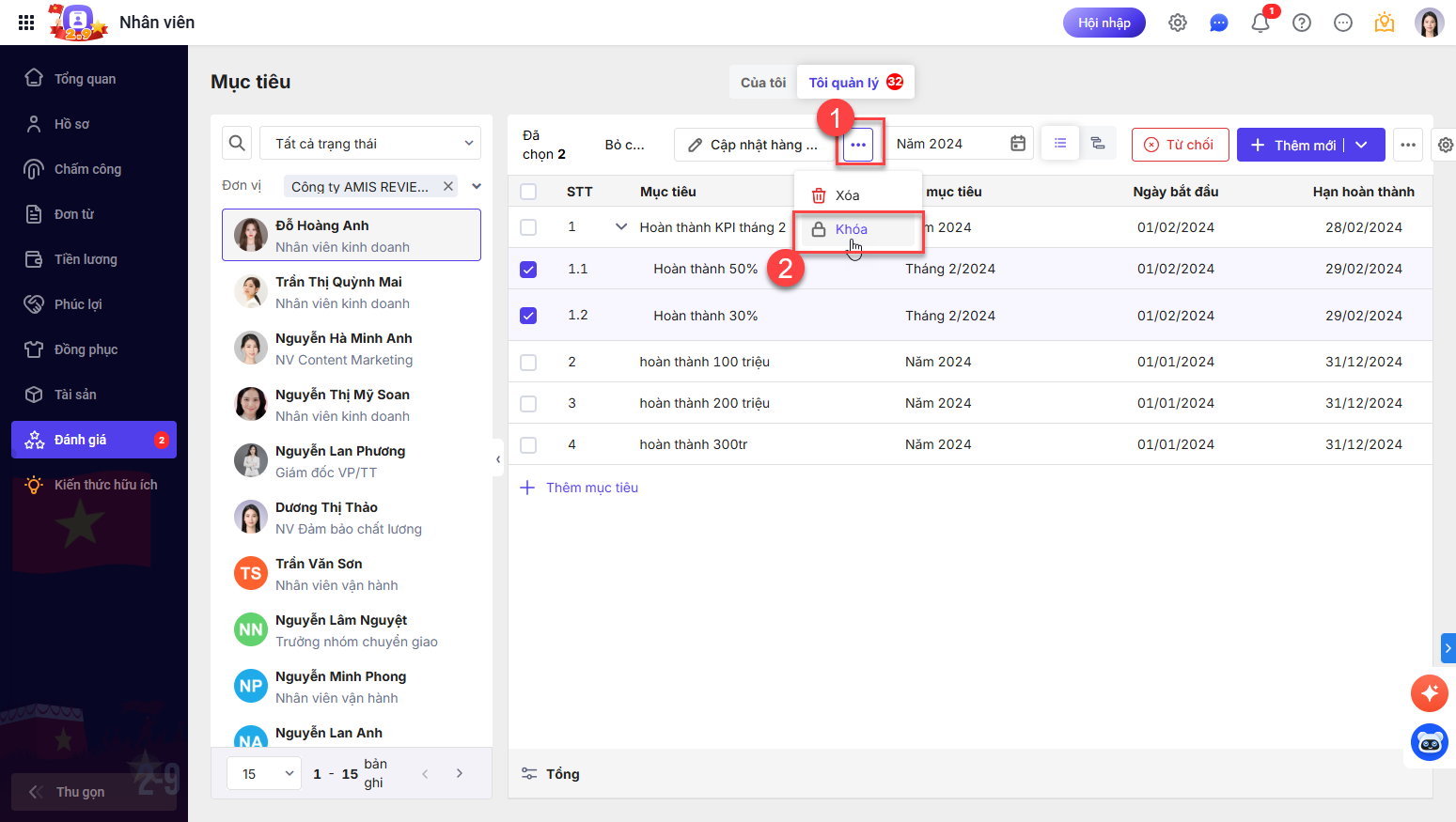 Tại phân hệ Đánh giá\Mục tiêu\tab Tôi quản lý\tích chọn 1 hay nhiều mục tiêu\chọn Khóa.