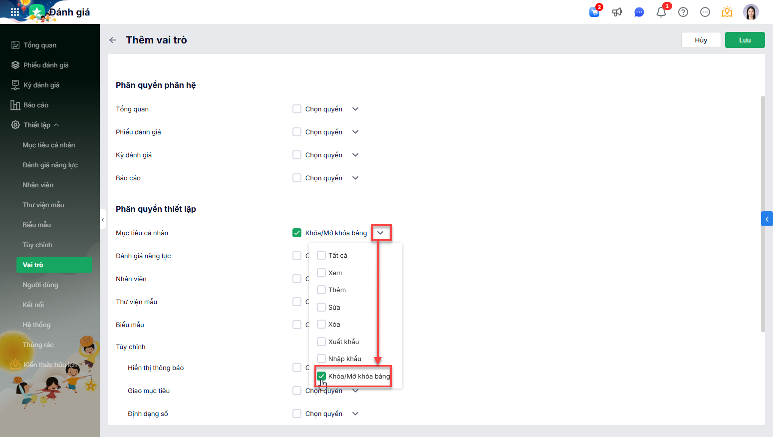Tại Thiết lập\Vai trò\Phân quyền thiết lập\Mục tiêu cá nhân: tích chọn thêm quyền Khóa/Mở khóa bảng.