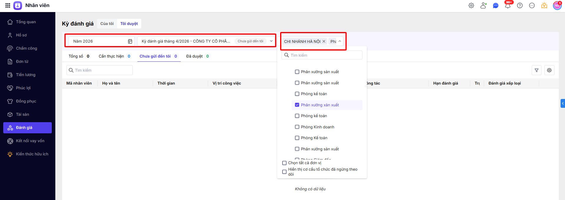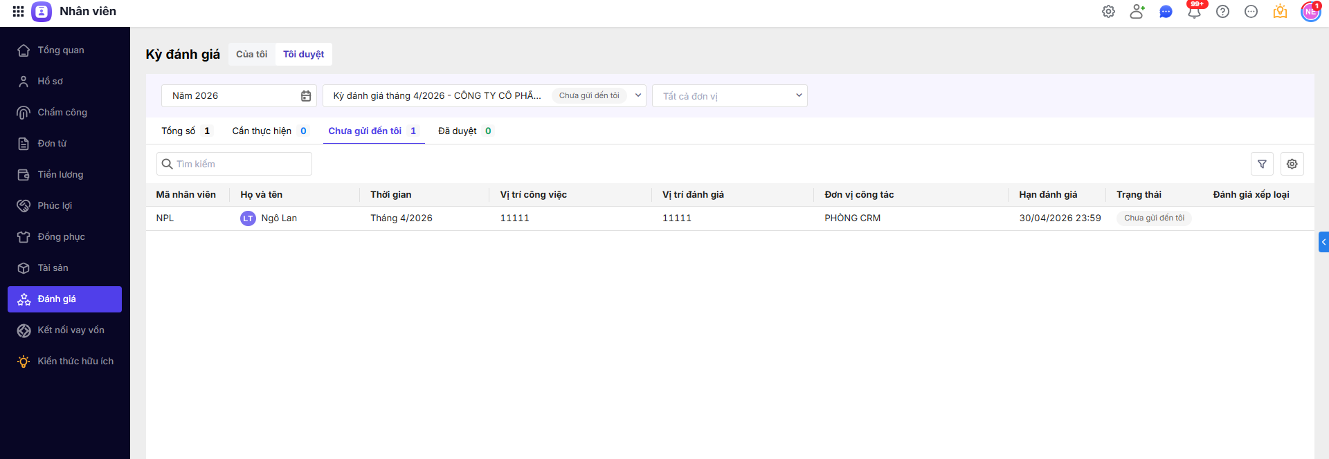 - Chưa gửi đến tôi: Danh sách nhân viên chưa gửi đánh giá.