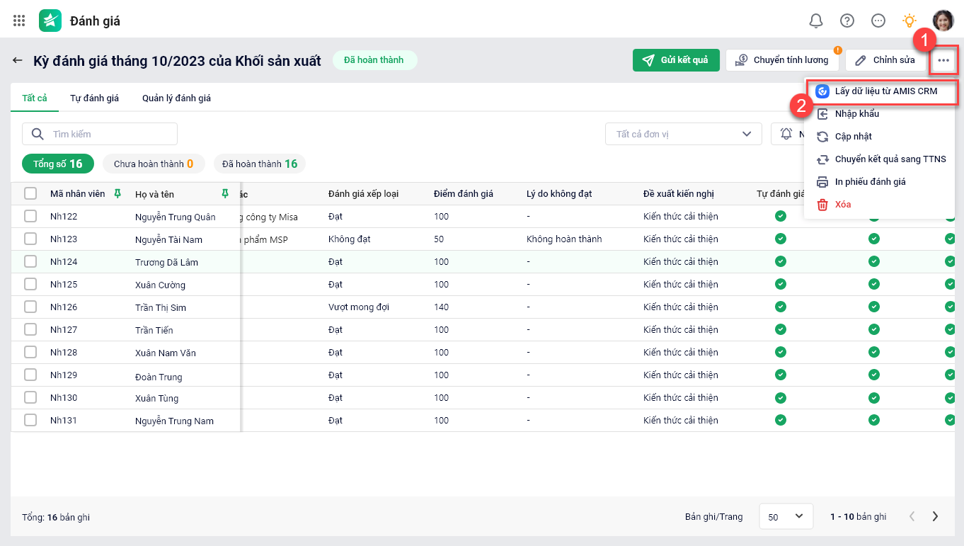 Tại AMIS Đánh giá\Kỳ đánh giá\chi tiết Kỳ đánh giá\chọn biểu tượng ba chấm\chọn Lấy dữ liệu từ AMIS CRM.