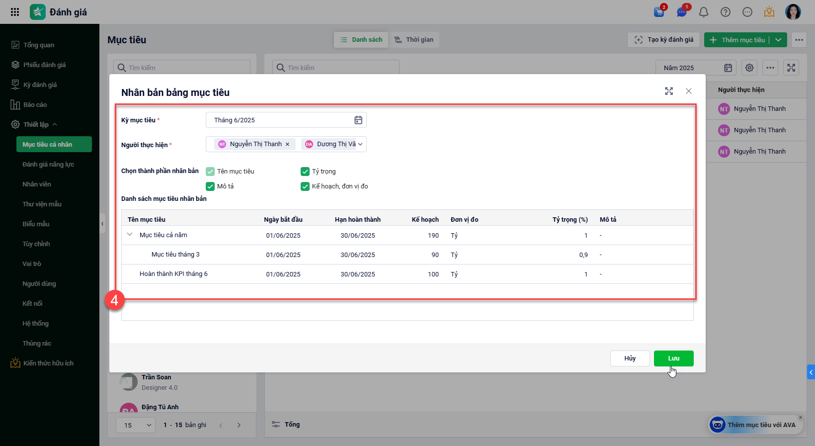 - Người thực hiện: chọn nhiều nhân viên có cùng danh sách mục tiêu.