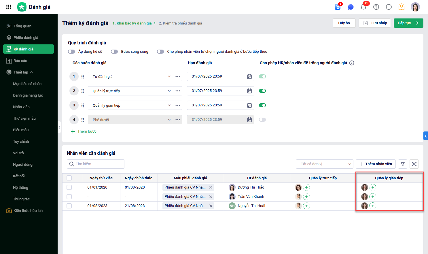 Tại chi tiết Kỳ đánh giá\Nhân viên cần đánh giá\cột Quản lý gián tiếp: chương trình sẽ tự động hiển thị quản lý gián tiếp đã được khai báo tại AMIS Thông tin nhân sự nếu Anh/Chị thiết lập quy trình đánh giá có bước Quản lý gián tiếp đánh giá.