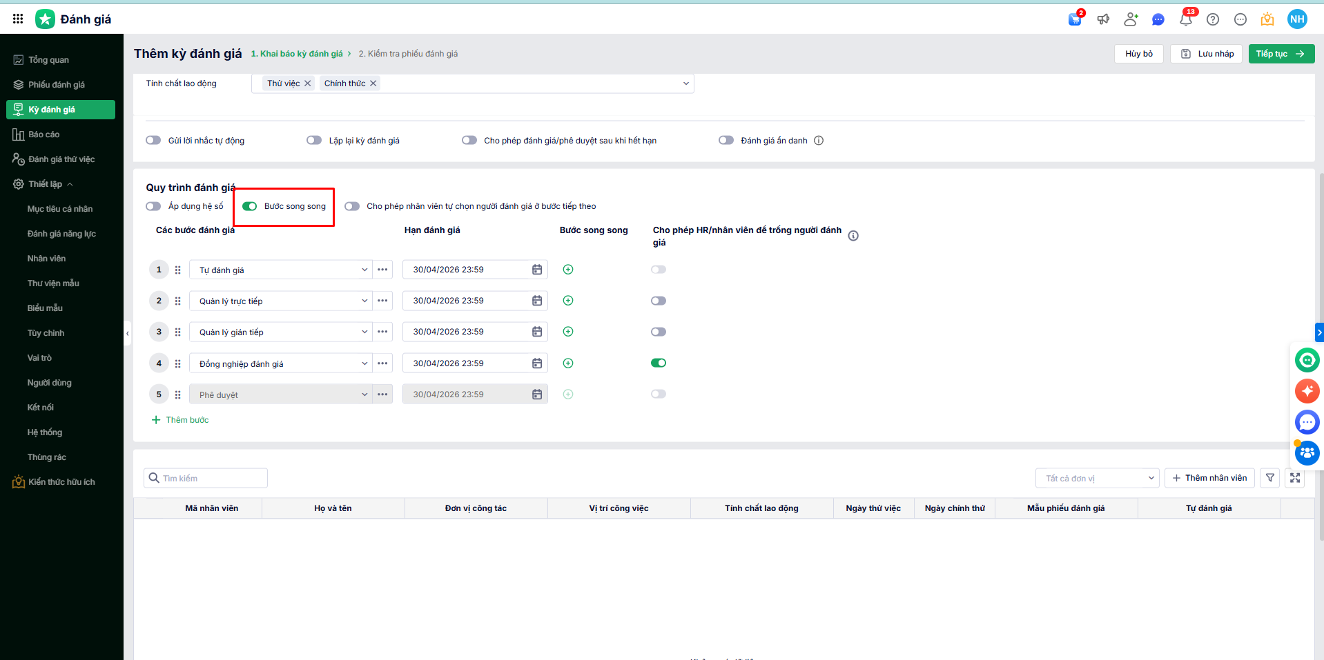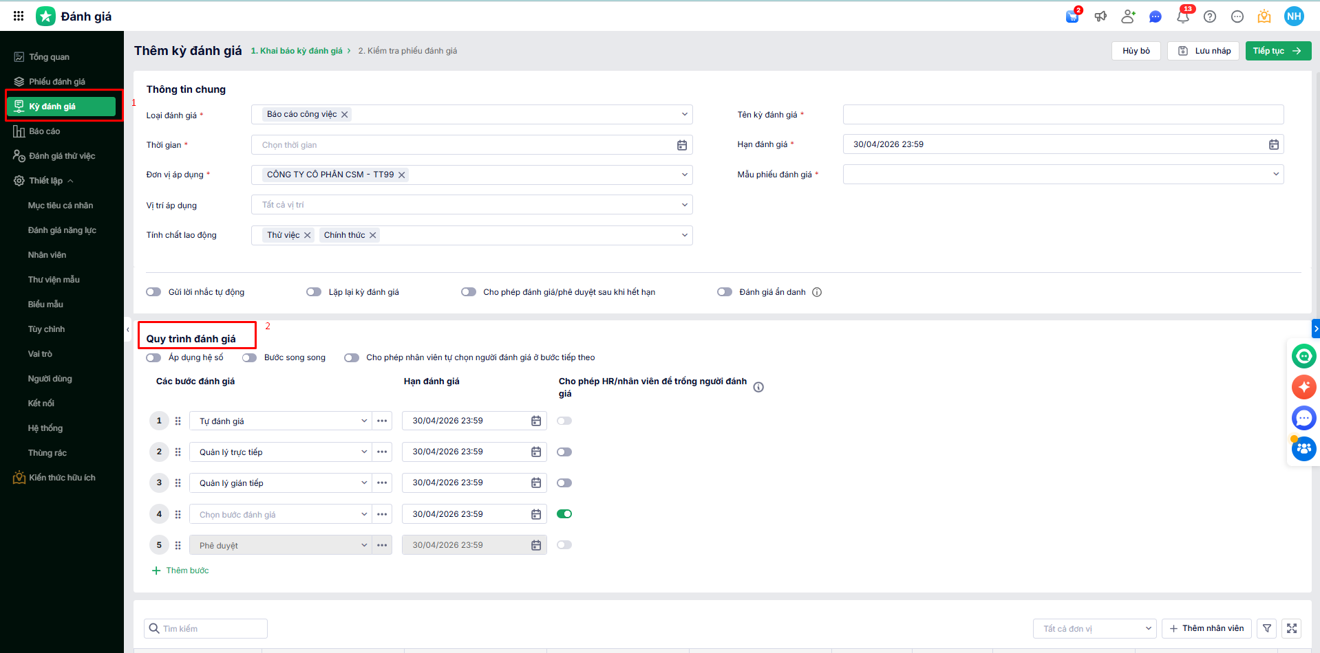 • Bật tắt thiết lập: Cho phép HR/nhân viên để trống người đánh giá.