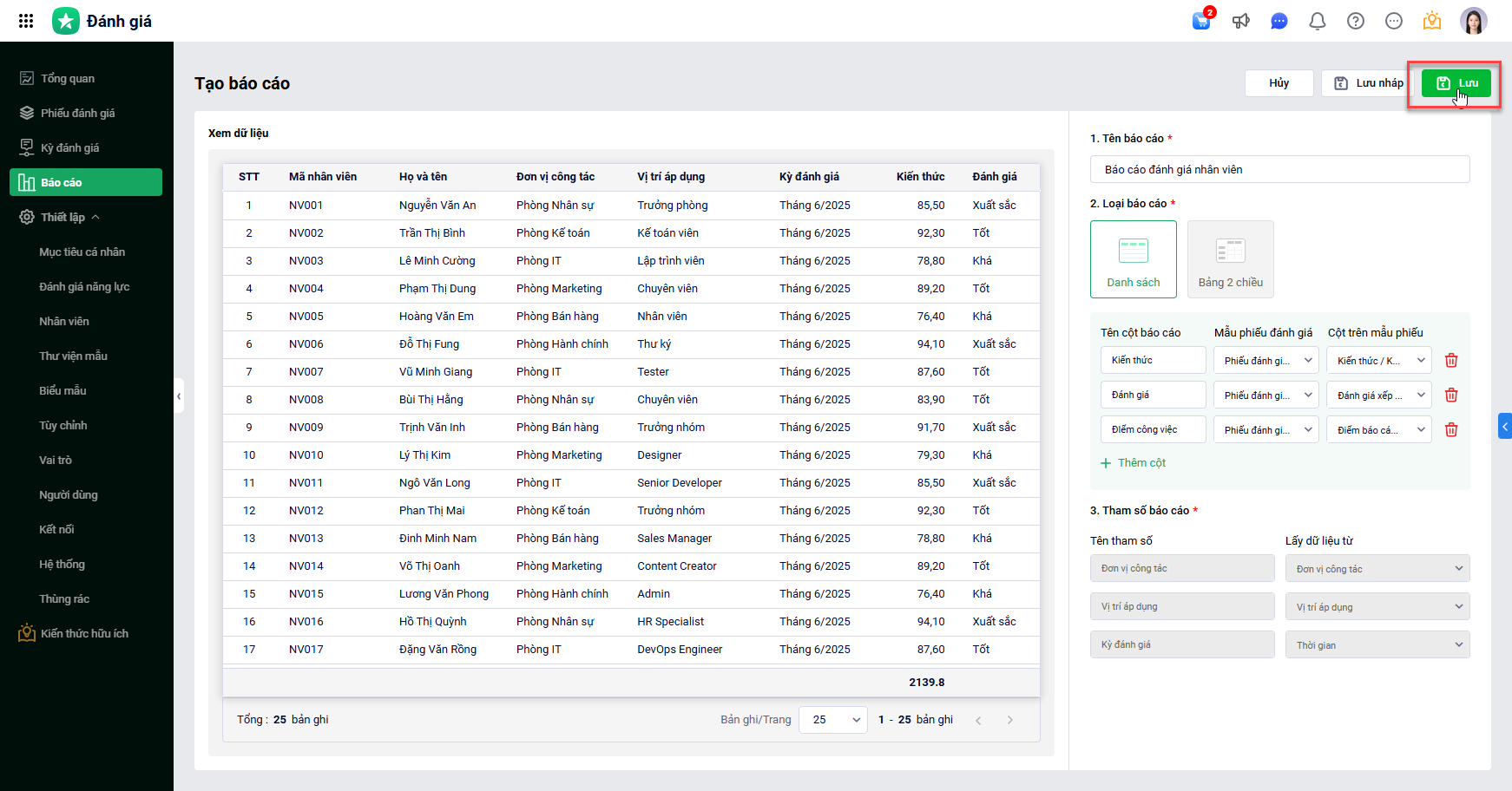 Sau khi thiết lập xong báo cáo, Anh/Chị xem lại dữ liệu báo cáo và nhấn Lưu để hoàn thành tạo báo cáo.