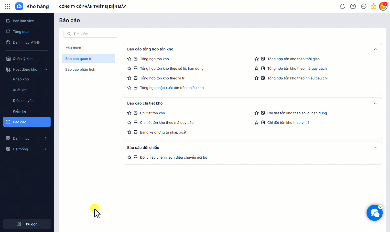 - Chọn kỳ báo cáo, chọn các kho muốn xem dữ liệu.