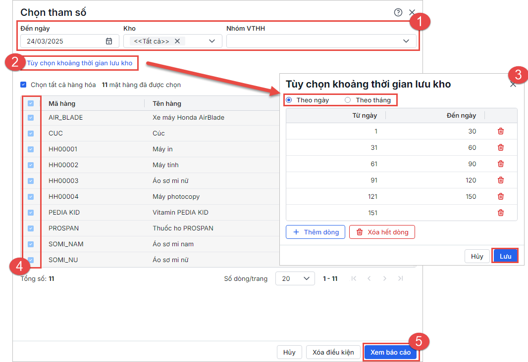 • Tùy chọn khoảng thời gian lưu kho theo ngày hoặc theo tháng.