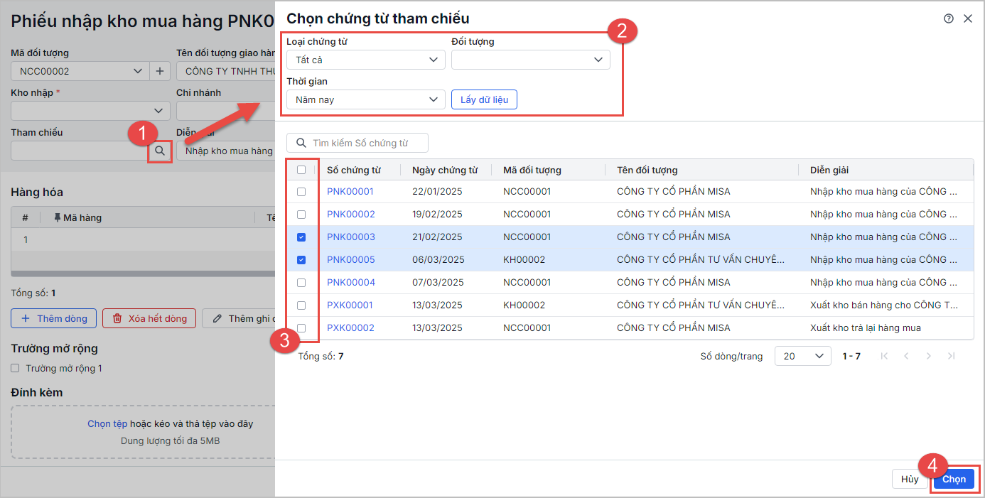 - Tích chọn chứng từ cần tham chiếu. Nhấn Chọn
