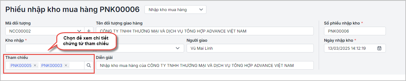Sau khi chọn xong chứng từ tham chiếu, chương trình tự động liệt kê số chứng từ vừa chọn tham chiếu trên chứng từ đang khai báo: