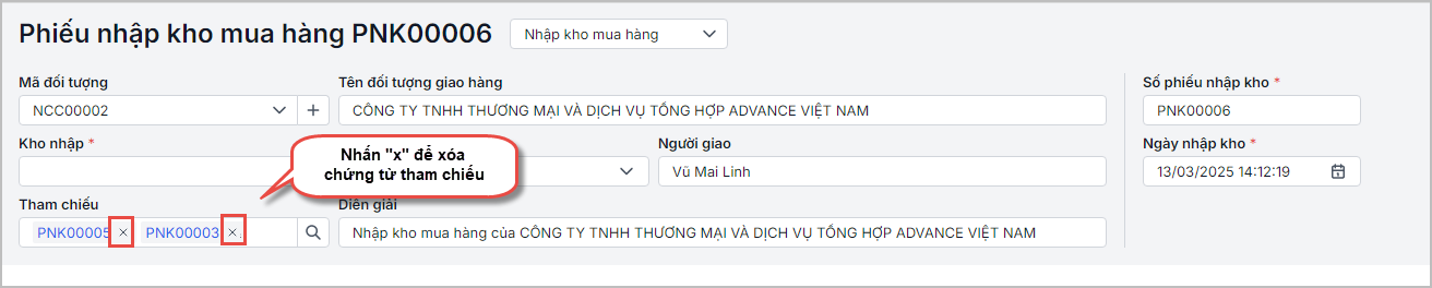 2. Đồng thời xoá bỏ chứng từ tham chiếu trong trường hợp chọn sai: