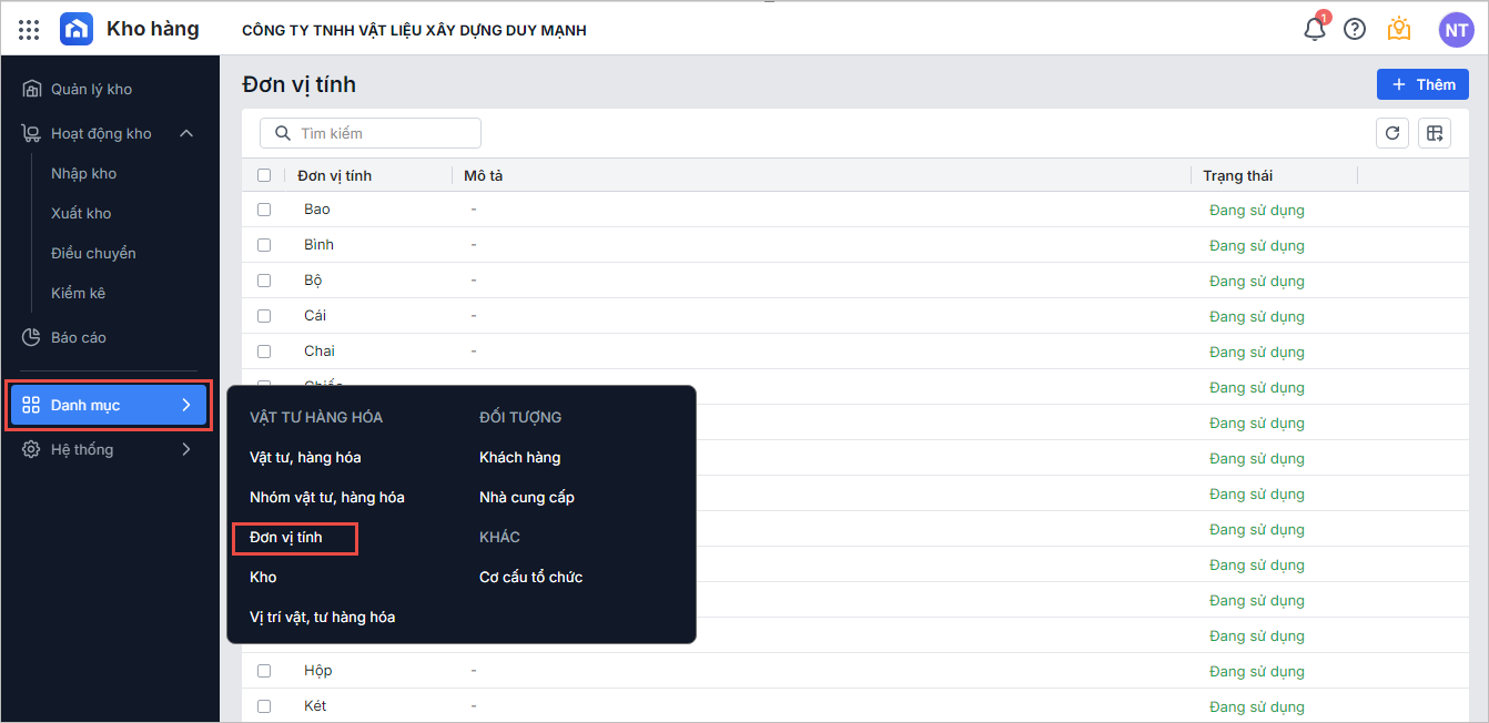 Chương trình đã thiết lập sẵn danh sách đơn vị tính phục vụ cho việc khai báo vật tư, hàng hoá. Bên cạnh đó, người dùng vẫn có thể bổ sung, sửa đổi lại đơn vị tính sao cho phù hợp với nhu cầu quản lý thực tế tại doanh nghiệp.