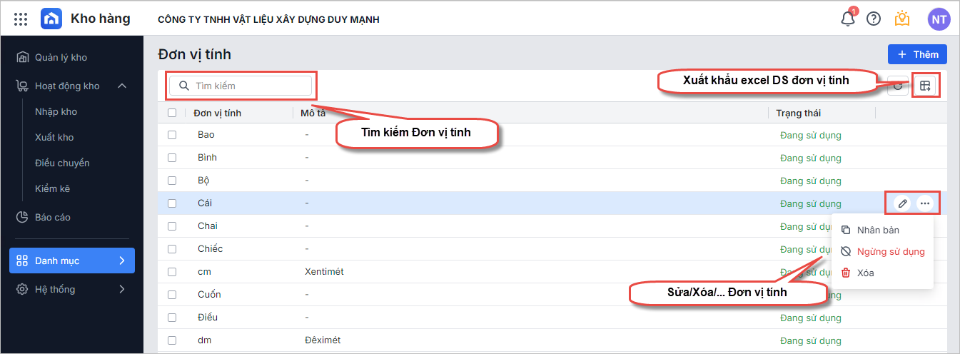 • Sửa/Xóa/Nhân bản/Ngừng sử dụng đơn vị tính