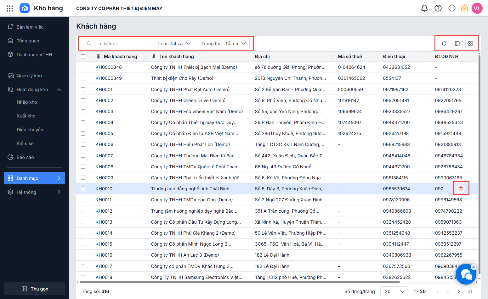 Lưu ý: Không thể xóa dữ liệu danh mục khi dữ liệu đó đã phát sinh chứng từ trên AMIS Kho hoặc các ứng dụng khác.