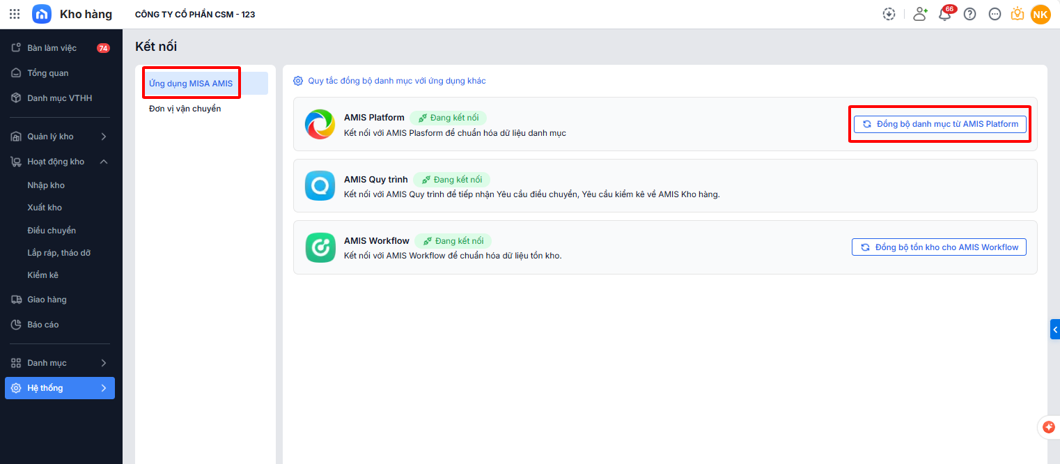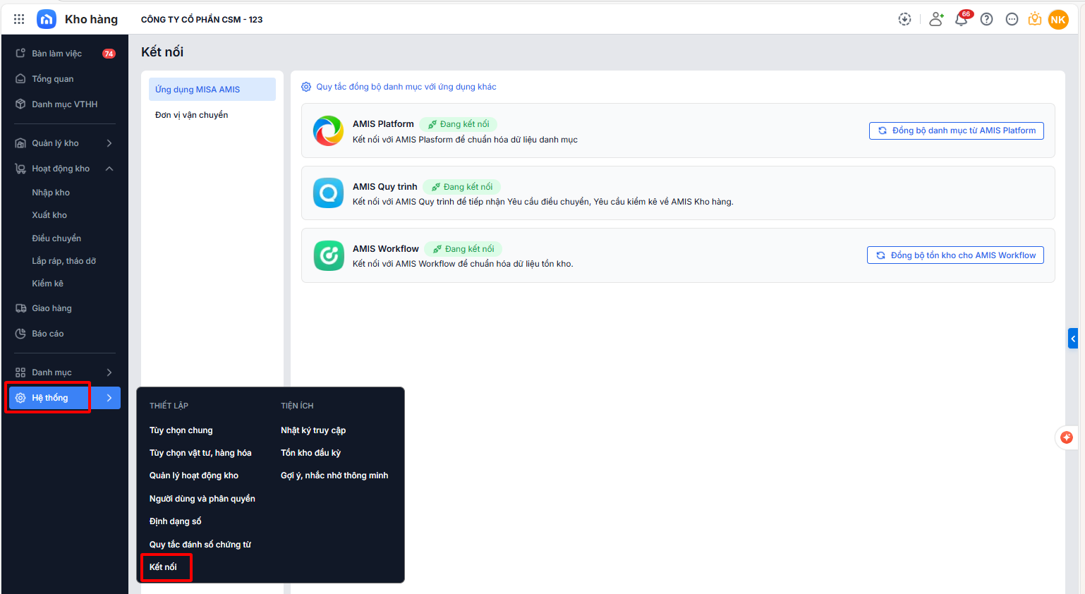 Bước 1: Trên AMIS Kho hàng\ Vào menu Hệ thống\ Kết nối.