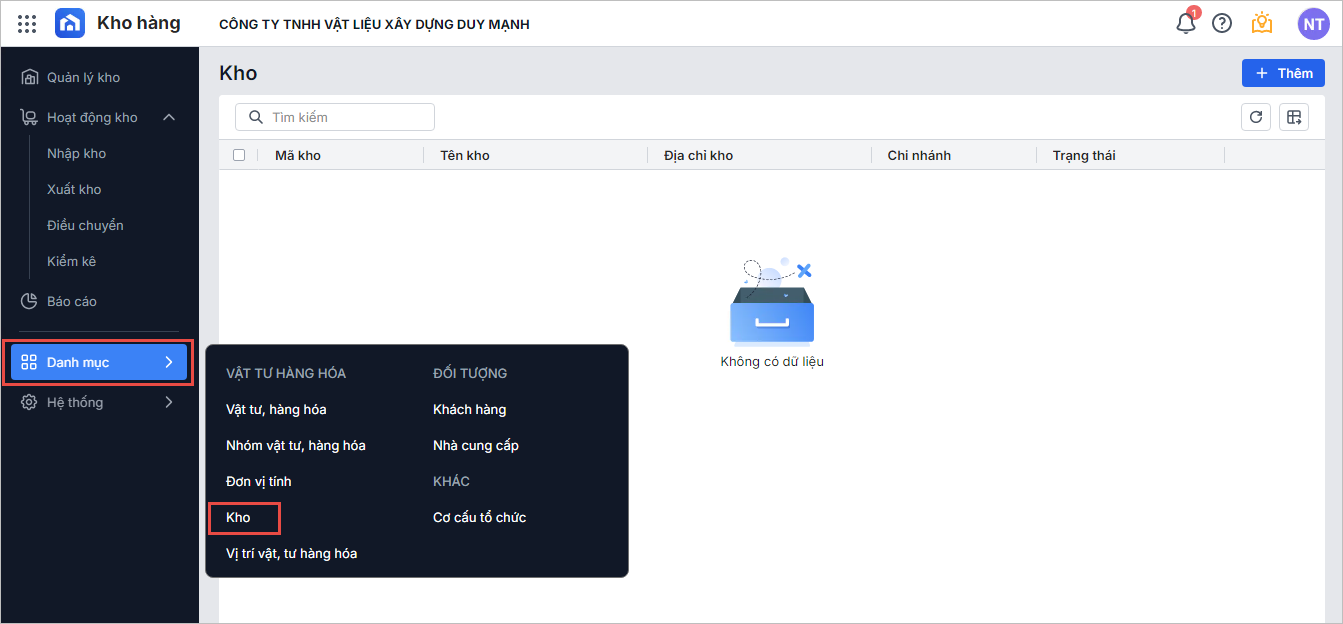 - Vào menu Danh mục\Nhóm Vật tư hàng hóa. Chọn Kho.