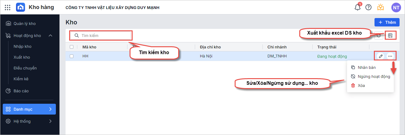 - Sửa/Xóa/Nhân bản/Ngừng sử dụng kho