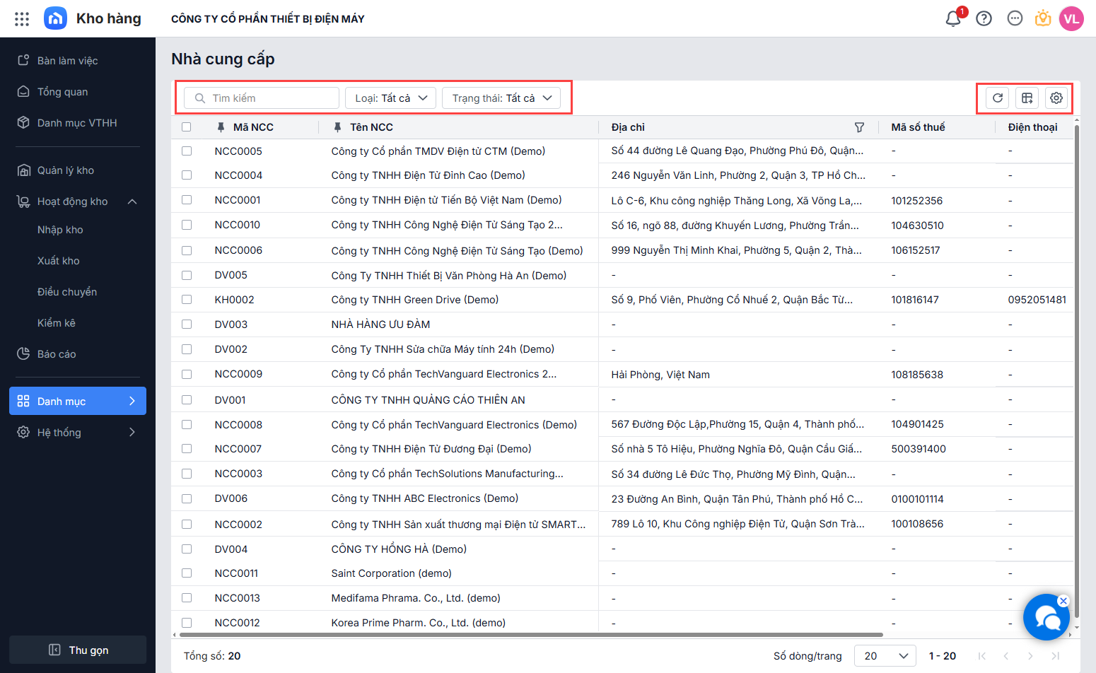 Tại giao diện danh sách Nhà cung cấp, người dùng có thể chọn các chức năng như: