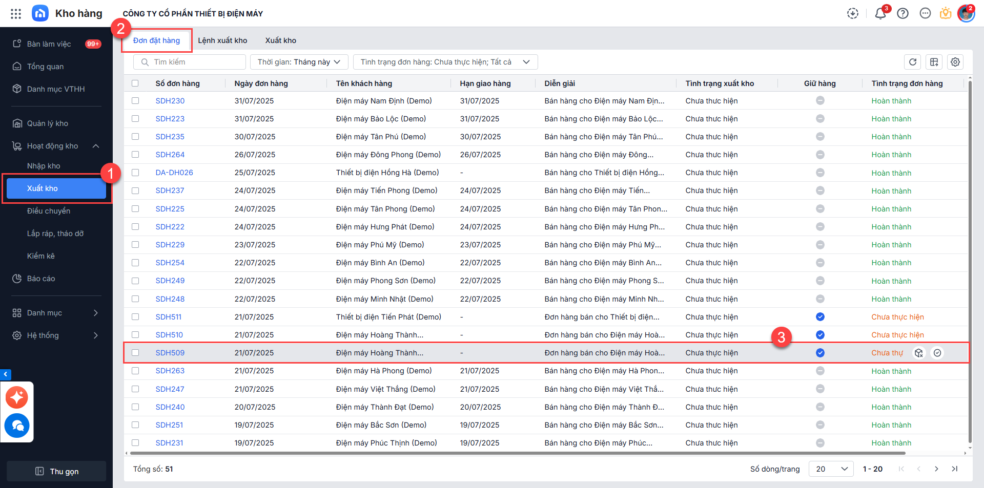 - Nếu đơn đặt hàng có các mặt hàng thuộc nhiều kho khác nhau, hệ thống sẽ tự động tạo nhiều lệnh xuất kho với trạng thái “Chưa thực hiện”, tương ứng với từng kho trên đơn hàng.