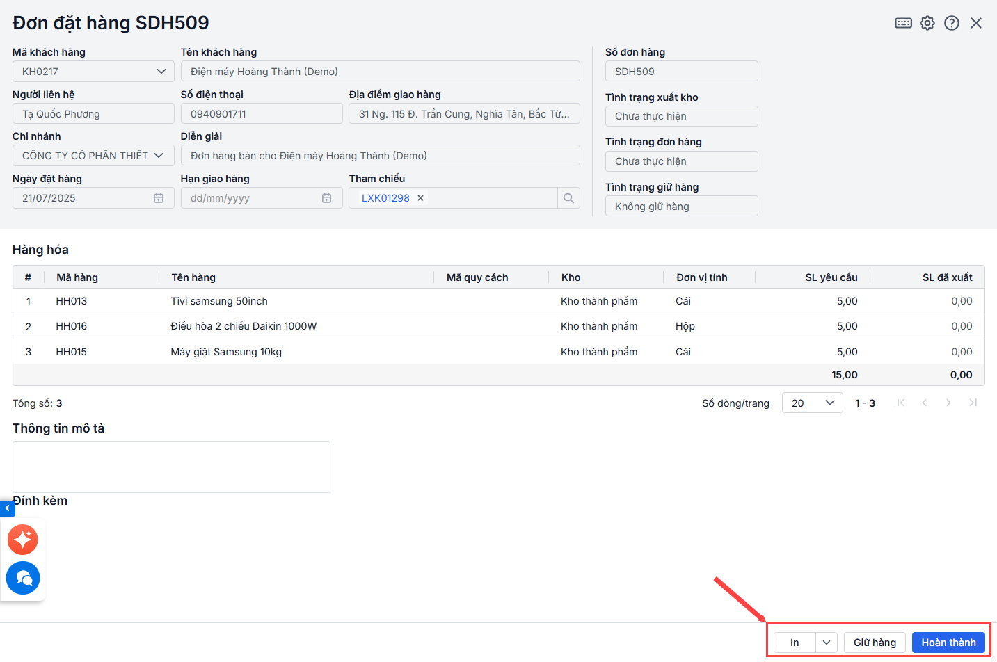 - Nếu tất cả các dòng hàng trên đơn đặt hàng thuộc cùng một kho, hệ thống sẽ tạo một lệnh xuất kho với trạng thái “Chưa thực hiện”.