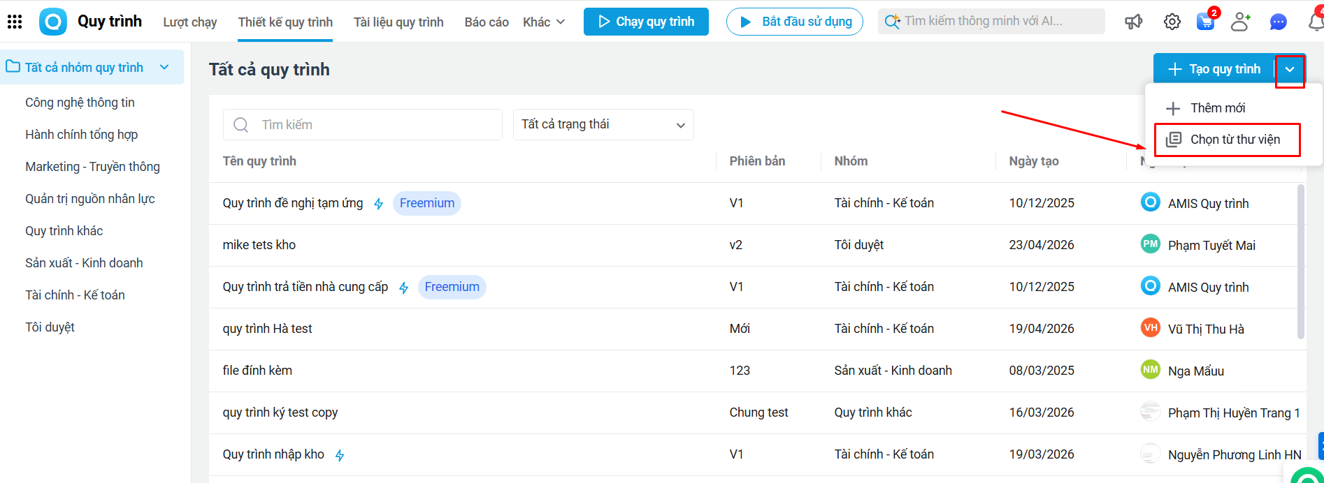Bước 2: Nhấn vào biểu tượng mũi tên mở rộng cạnh Tạo quy trình\ Chọn từ thư viện mẫu.
