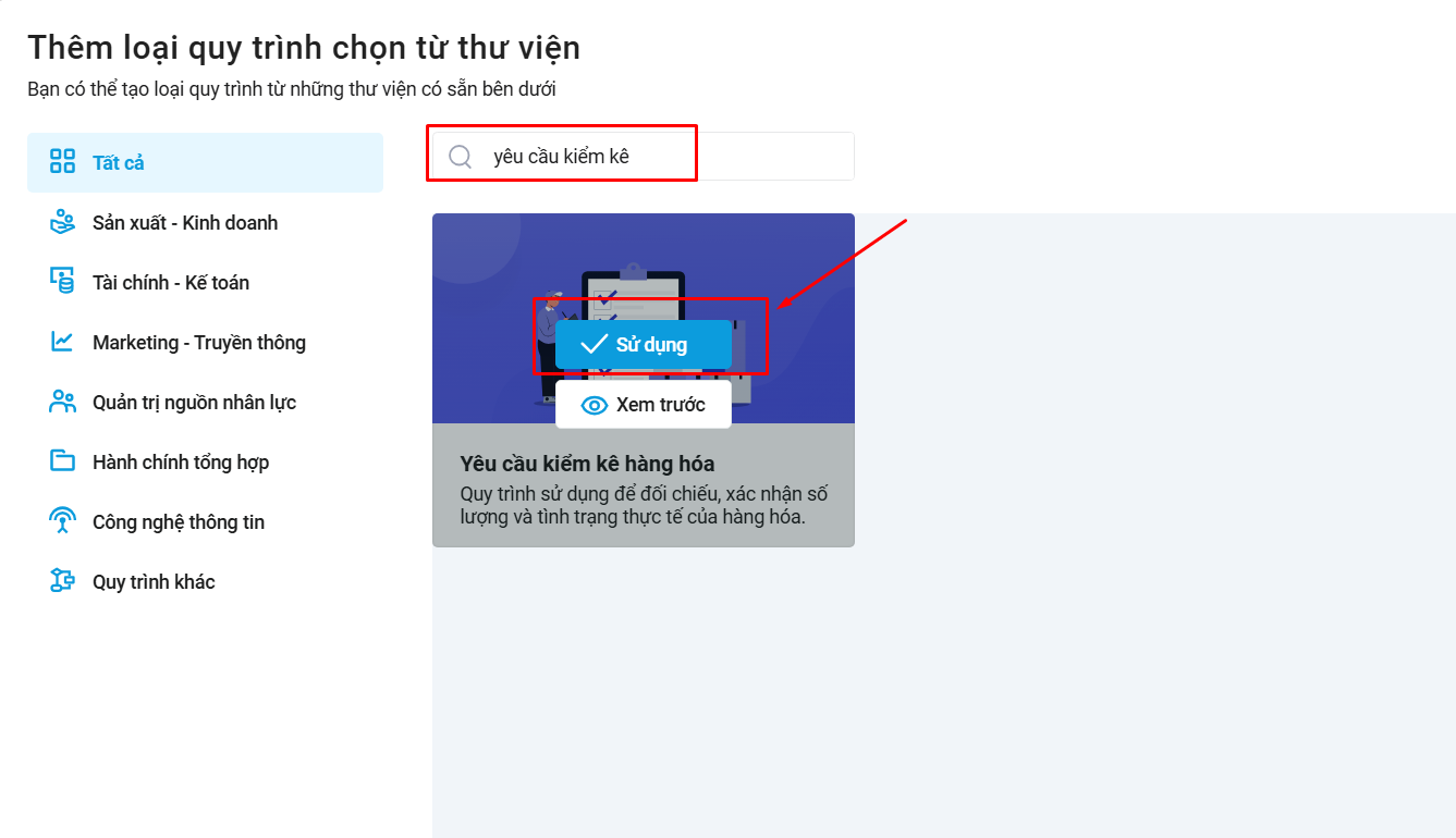 Bước 3: Tìm Yêu cầu kiểm kê\ Nhấn Sử dụng.