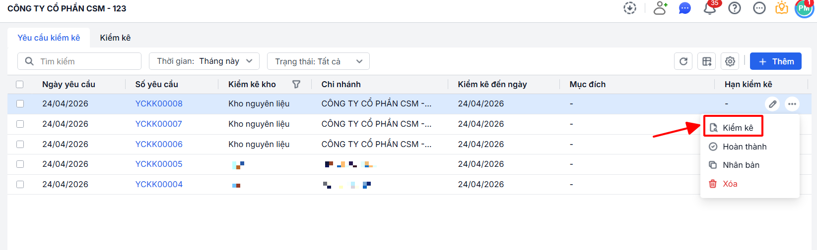 Bước 2: Nhân viên kho mở yêu cầu\ Thực hiện kiểm kê\ Chọn Hoàn thành để thay đổi trạng thái YCKK.