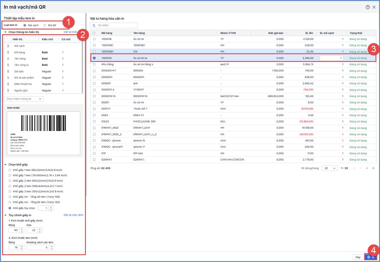 2.1. In mã vạch/mã QR vật tư hàng hóa thông thường
