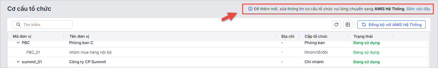 Lưu ý: Để thêm mới, sửa thông tin cơ cấu tổ chức, người dùng thực hiện trên AMIS Hệ thống