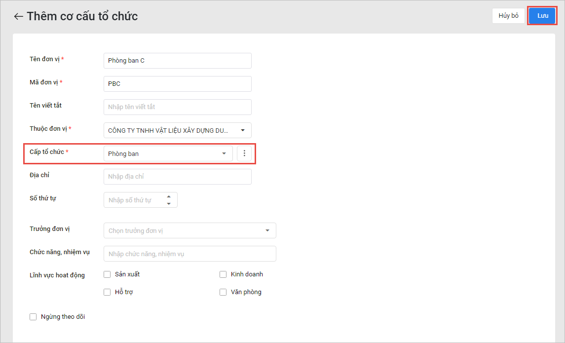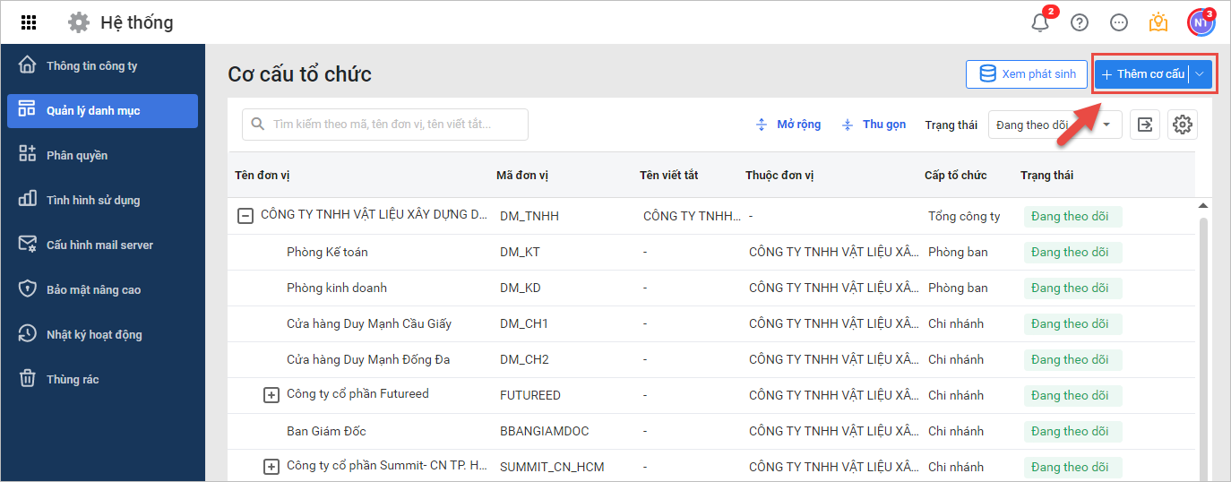 - Tại tab Cơ cấu tổ chức, nhấn Thêm cơ cấu: