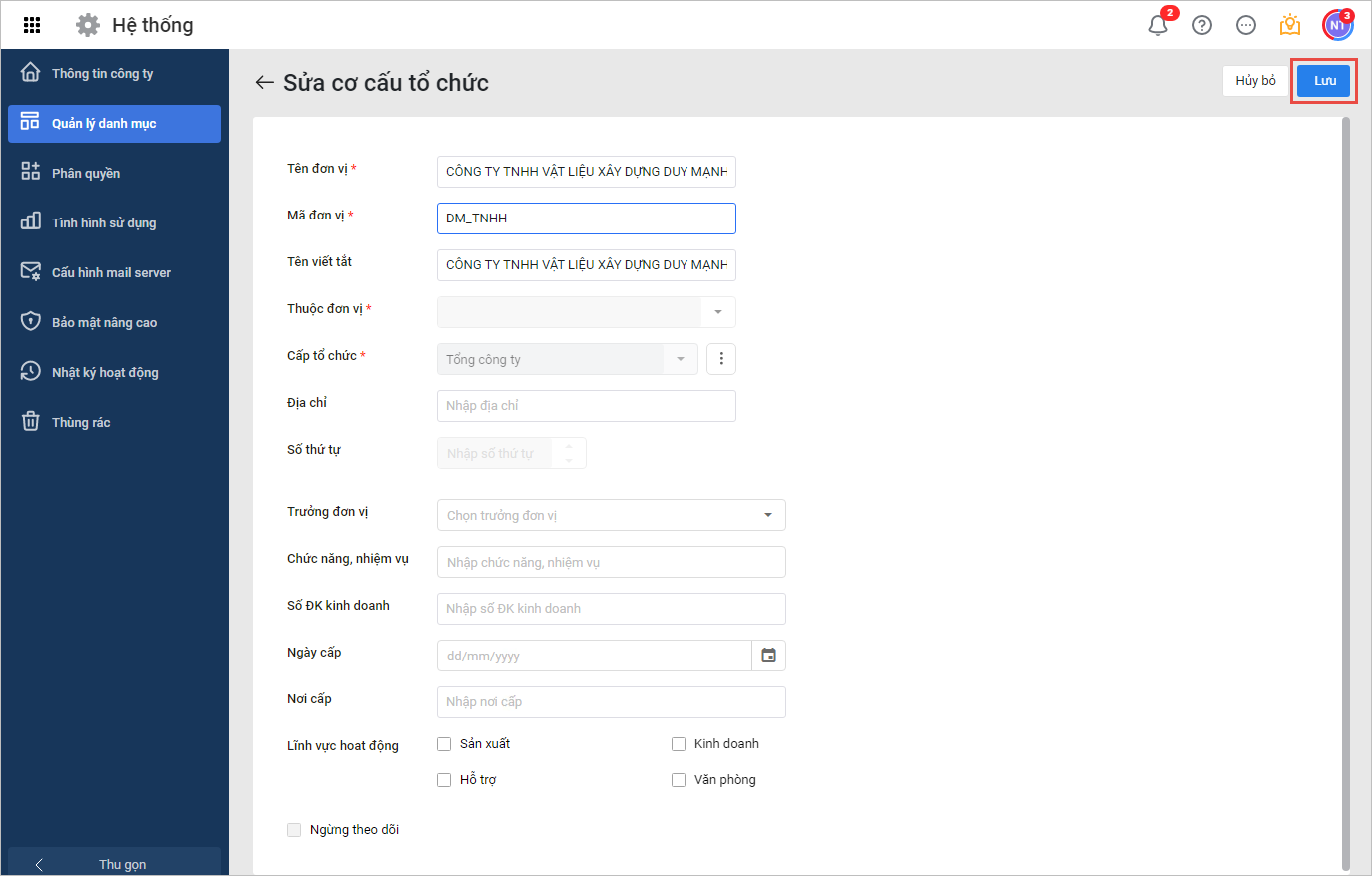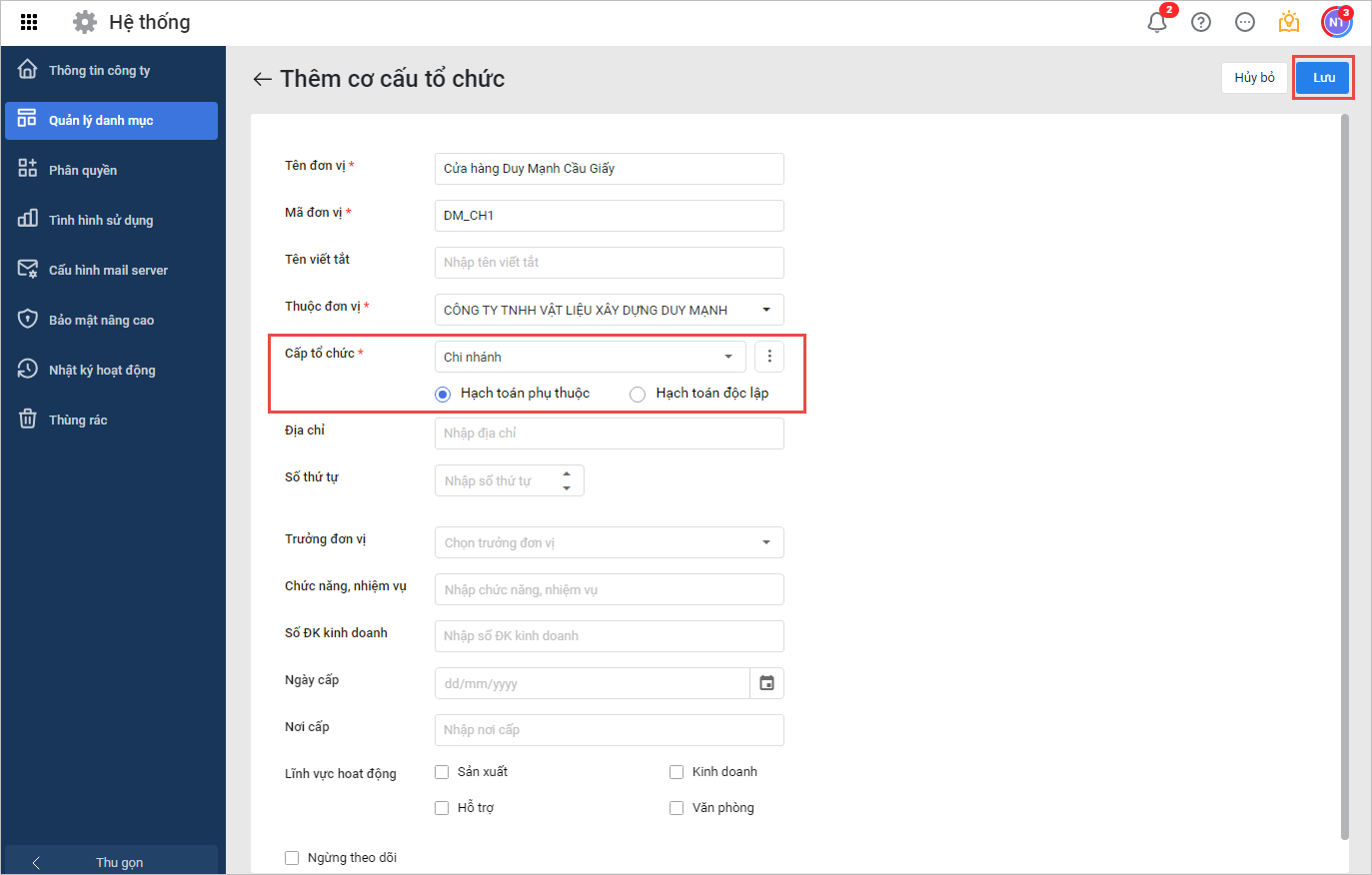 Cho phép khai báo thông tin về một chi nhánh/phòng ban/bộ phận trong doanh nghiệp.
