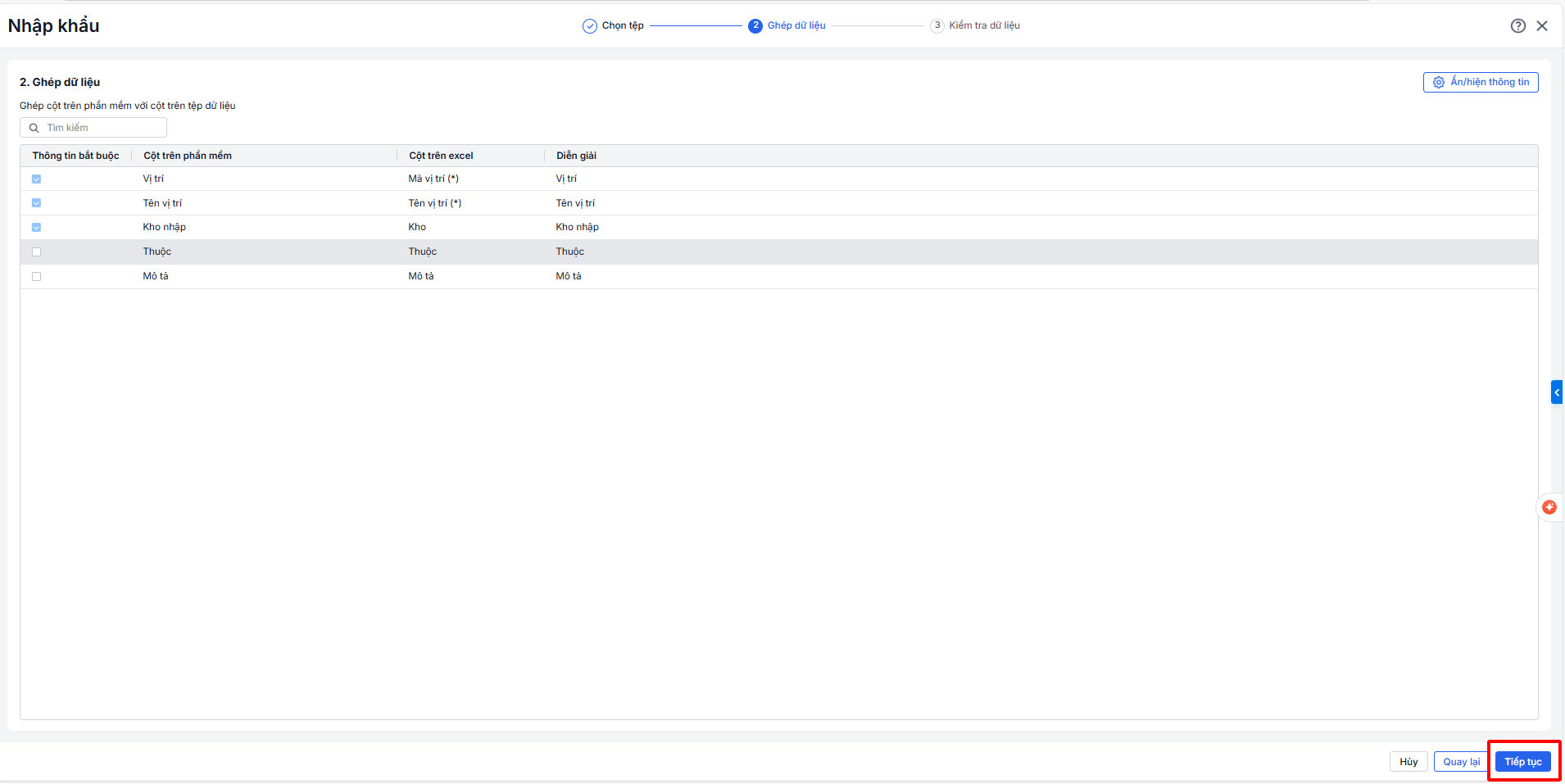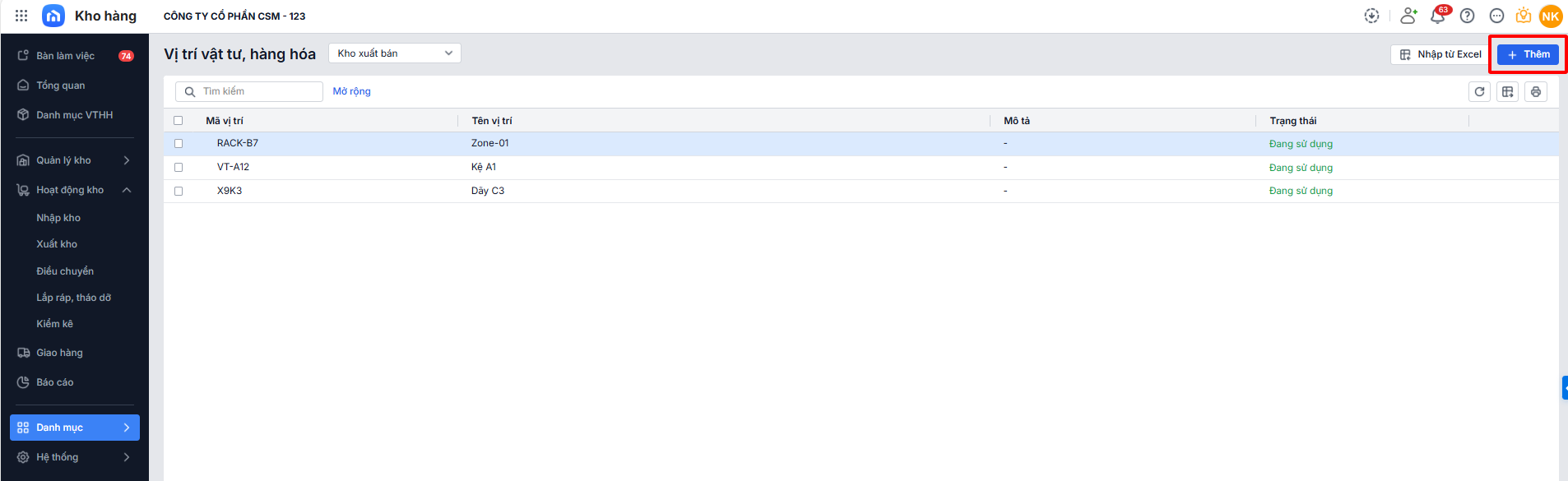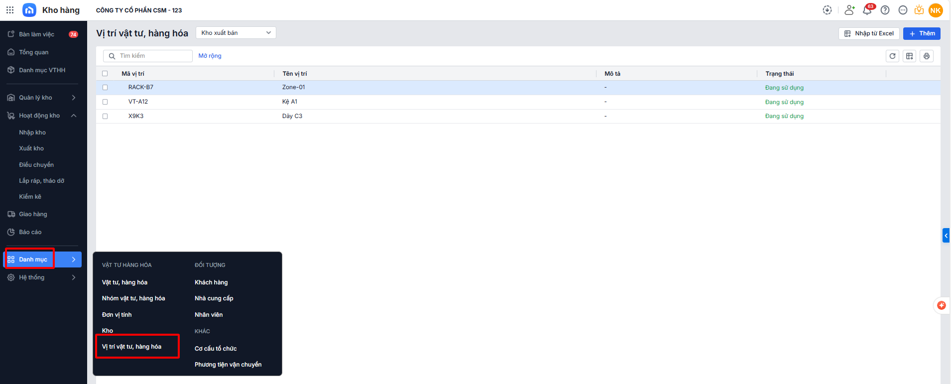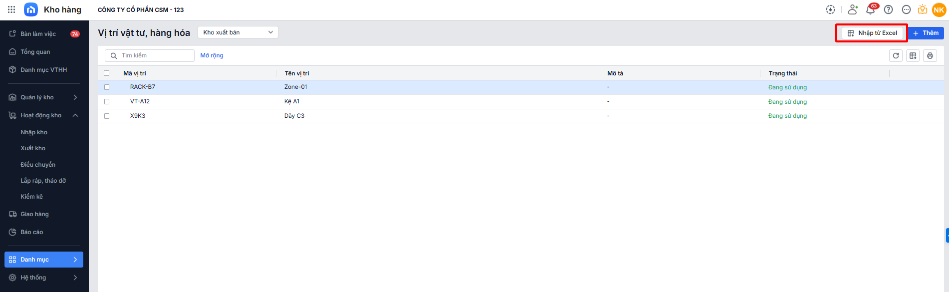 - Thêm mới hàng loạt vị trí vật tư, hàng hóa bằng nhập khẩu từ Excel.