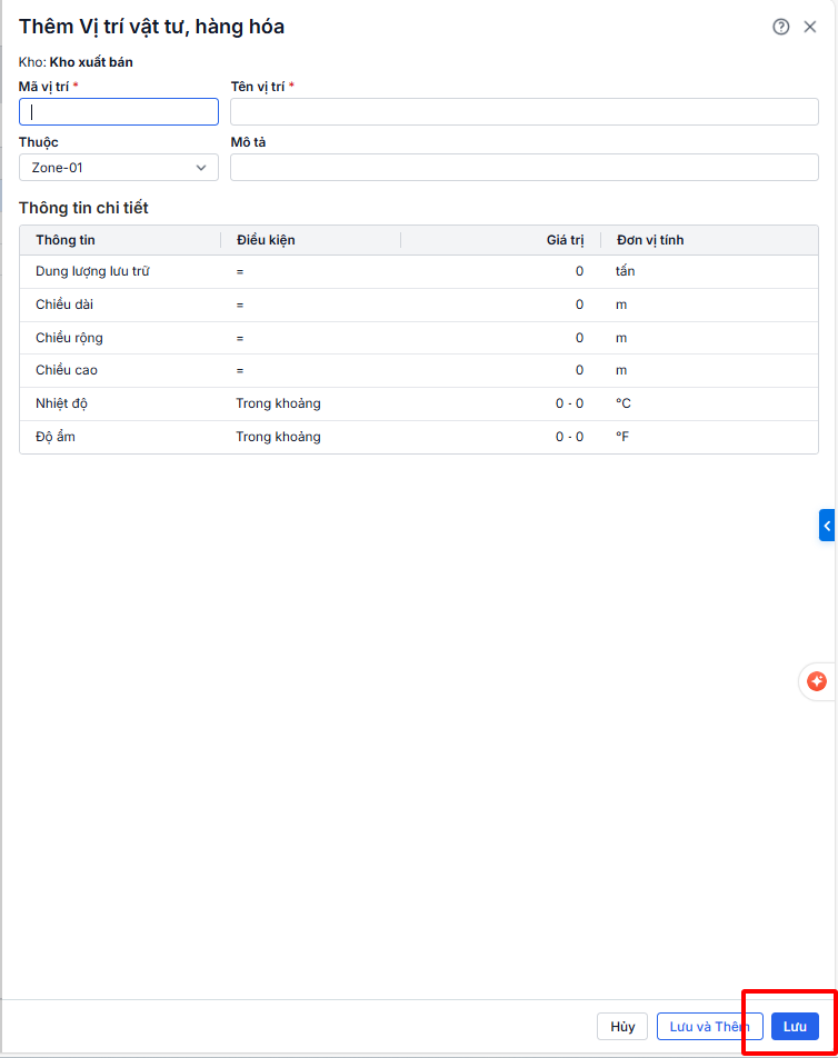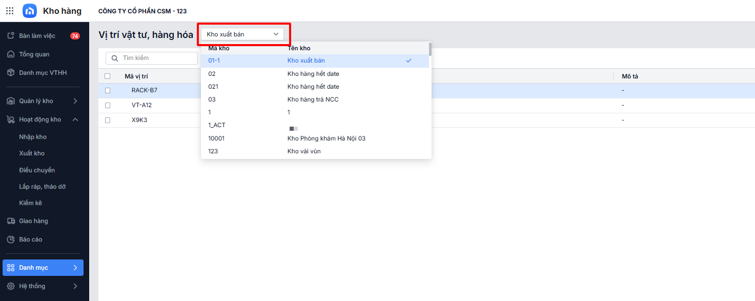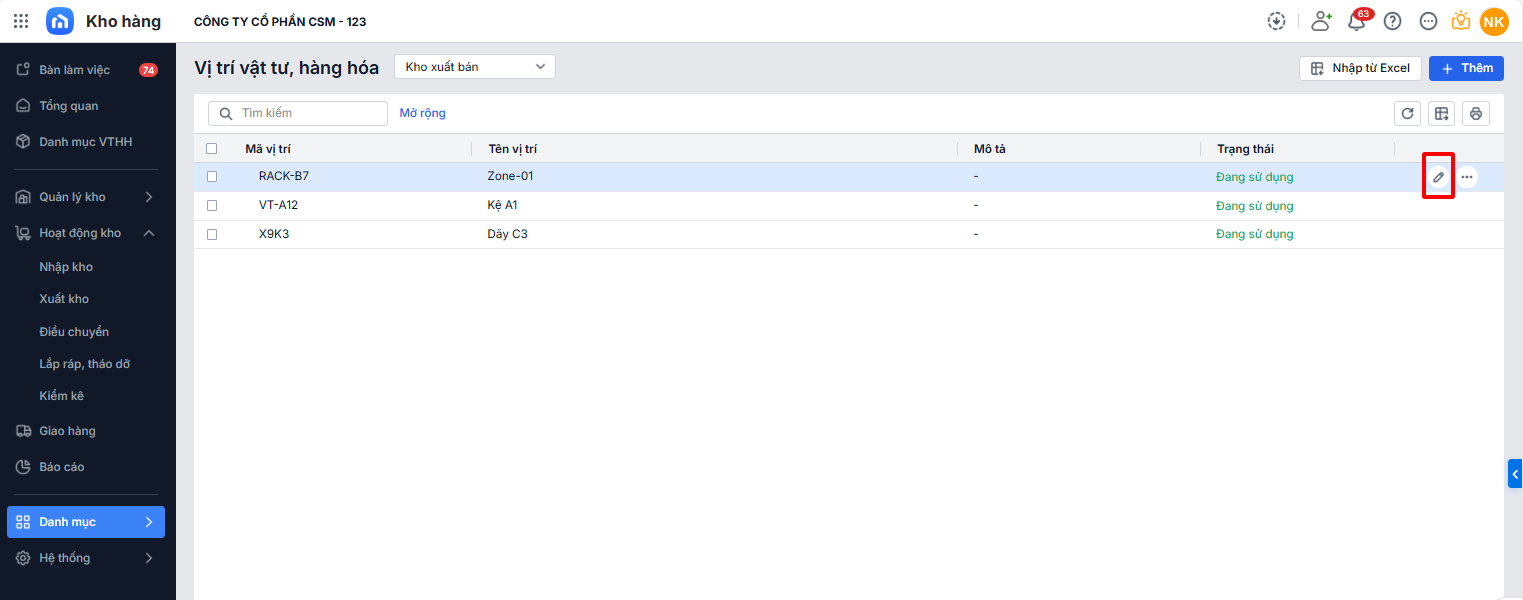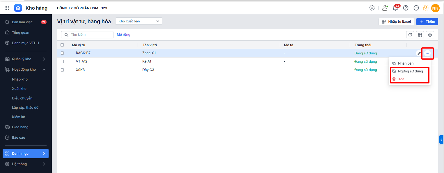 - Sửa, nhân bản, xóa, ngừng sử dụng vị trí vật tư, hàng hóa.
