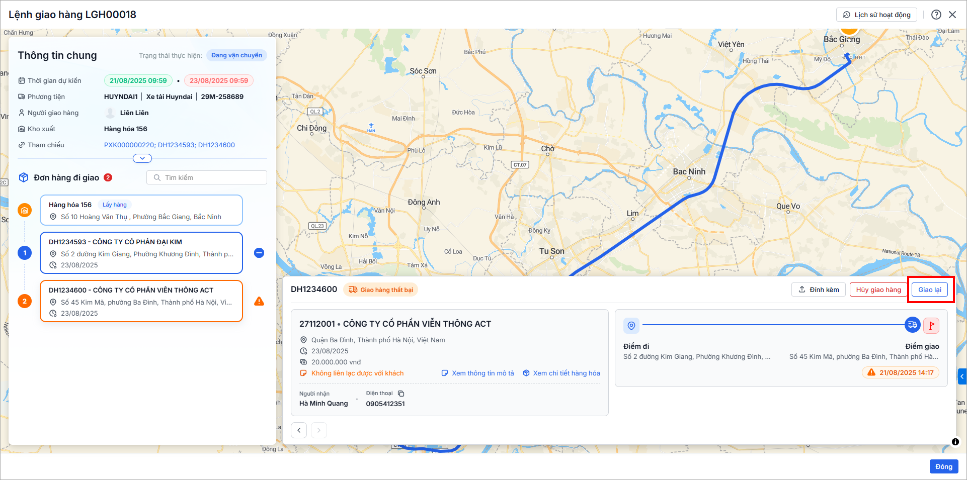 Nhấn Giao lại. Hệ thống sẽ cập nhật tình trạng vận chuyển của đơn đặt hàng là Giao lại lần <x>.