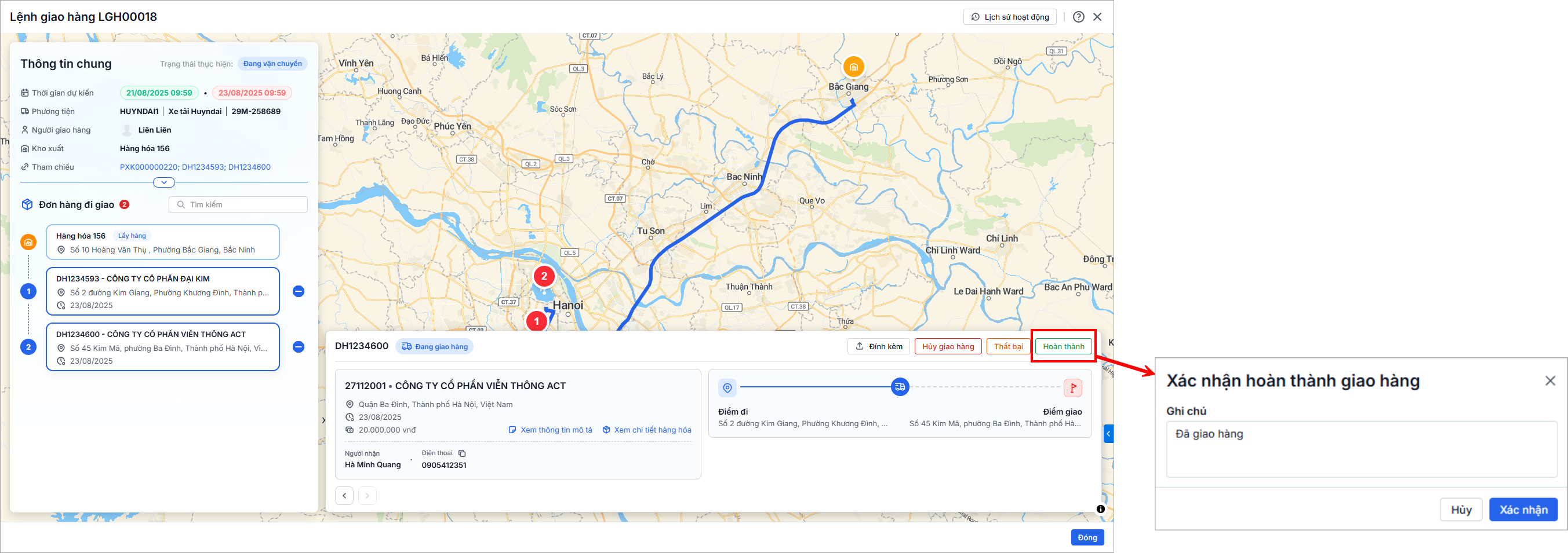 - Hoàn thành (áp dụng với đơn đặt hàng có trạng thái là Đang giao hàng, Giao lại lần <x>)