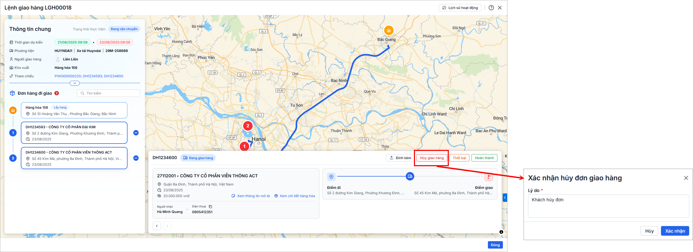 - Hủy giao hàng (áp dụng với đơn đặt hàng có trạng thái là Đang giao hàng, Giao hàng thất bại, Giao lại lần <x>)